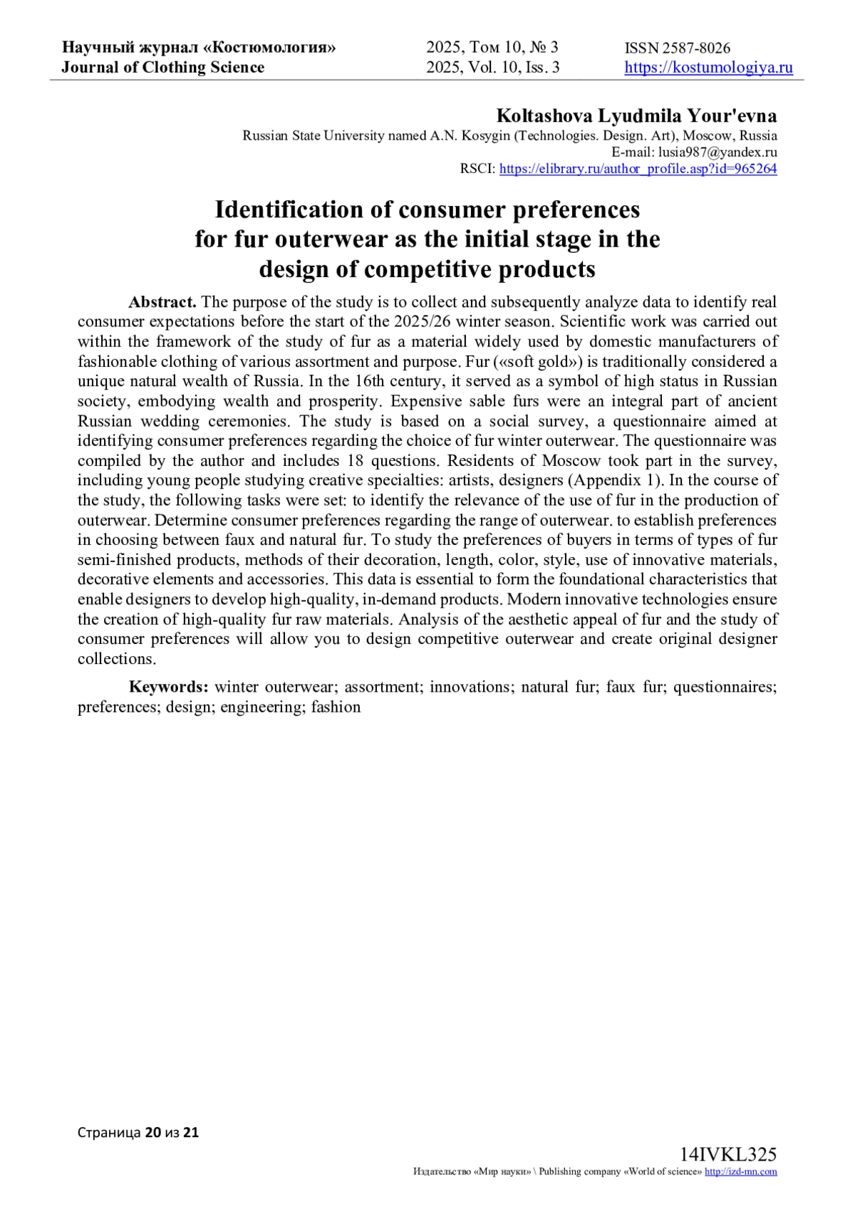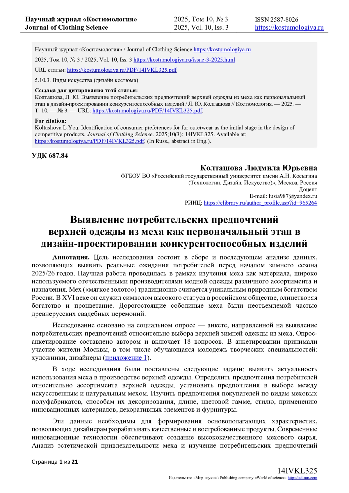 1. Карамазова А.Ю., Алибекова М.И., Колташова Л.Ю. Анализ, социальный прогноз и проектирование - основные этапы разработки авторской коллекции из меха // Инновационное развитие техники и технологий в промышленности (ИНТЕКС-2022): сборник материалов Всероссийской научной конференции молодых исследователей с международным участием, Москва, 18-20 апреля 2022 года / Российский государственный университет им. А.Н. Косыгина (Технологии. Дизайн. Искусство). Том Часть 1. - Москва: ФГБОУ ВО “РГУ имени А.Н. Косыгина”, 2022. - С. 147-151. EDN: IOJBLG