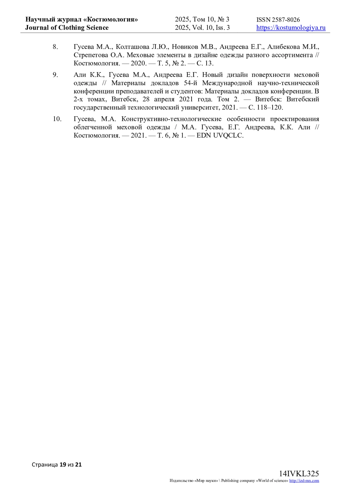 10. Гусева, М.А. Конструктивно-технологические особенности проектирования облегченной меховой одежды / М.А. Гусева, Е.Г. Андреева, К.К. Али // Костюмология. - 2021. - Т. 6, № 1. EDN: UVQCLC