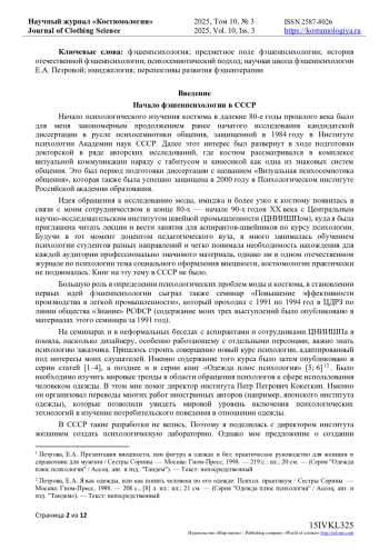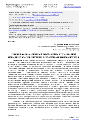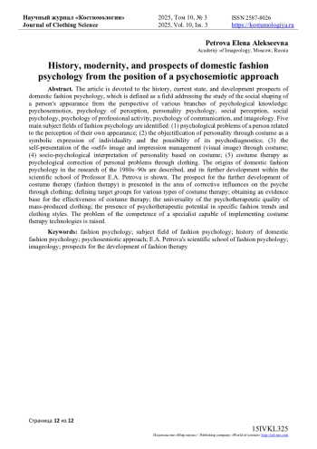 Статья посвящена истории, современному состоянию и перспективам развития отечественной фэшенпсихологии, которая определена как область, обращающаяся к изучению социального оформления внешности человека с позиции различных разделов психологического знания: психосемиотики, психология восприятии, психологии личности, социальной перцепции, социальной психологии, психологии профессиональной деятельности, психология общения и имиджелогии. Выделены пять основных предметных полей фэшенпсихологии: (1) психологические проблемы человека, связанные с восприятием собственной внешности; (2) объективизация личности в костюме как знаковом выражении индивидуальности и возможности ее психодиагностики; (3) самоподача образа «я» и управление впечатлением (визуальным имиджем) с помощью костюма; (4) социально-психологическая интерпретация личности на основе костюма; (5) костюмотерапия как психологическая коррекция личностных проблем с помощью одежды. Описаны истоки отечественной фэшенпсихологии в исследованиях 80-90 годов ХХ века, показано ее дальнейшее развитие в научной школе профессора Е. А. Петровой. Представлена перспектива дальнейшей разработки костюмотерапии (фэшентерапии) в зоне коррекционных воздействий на психику с помощью одежды; определения целевых групп для различных видов костюмотерапии; получения доказательной базы эффективности костюмотерапии; универсальности психотерапевтичности одежды массового производства; наличия психотерапевтического потенциала отдельных направлений моды, стилей одежды. Поставлена проблема компетенции специалиста, способного реализовывать технологии костюмотерапии.