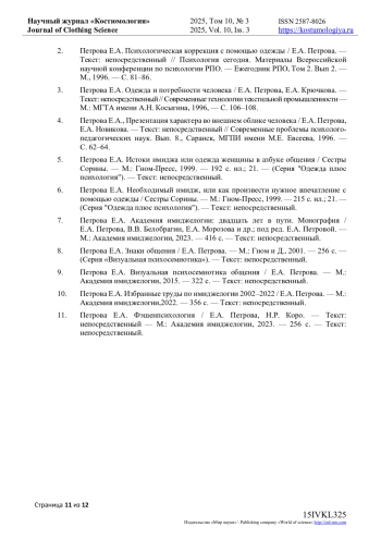 1. Петрова Е.А. Самопрезентация личности в одежде / Е.А. Петрова. - Текст: непосредственный // Современные проблемы психолого-педагогических наук. - Межвуз. сб. научн. тр., Вып. 8. - Саранск, 1996. - С. 64-66.