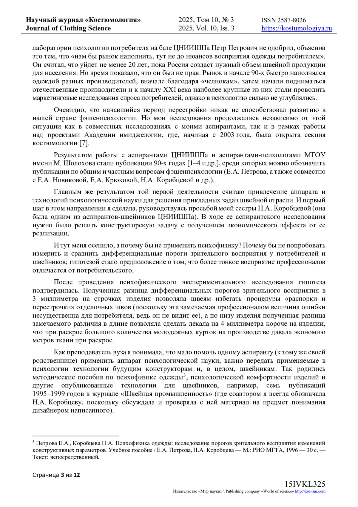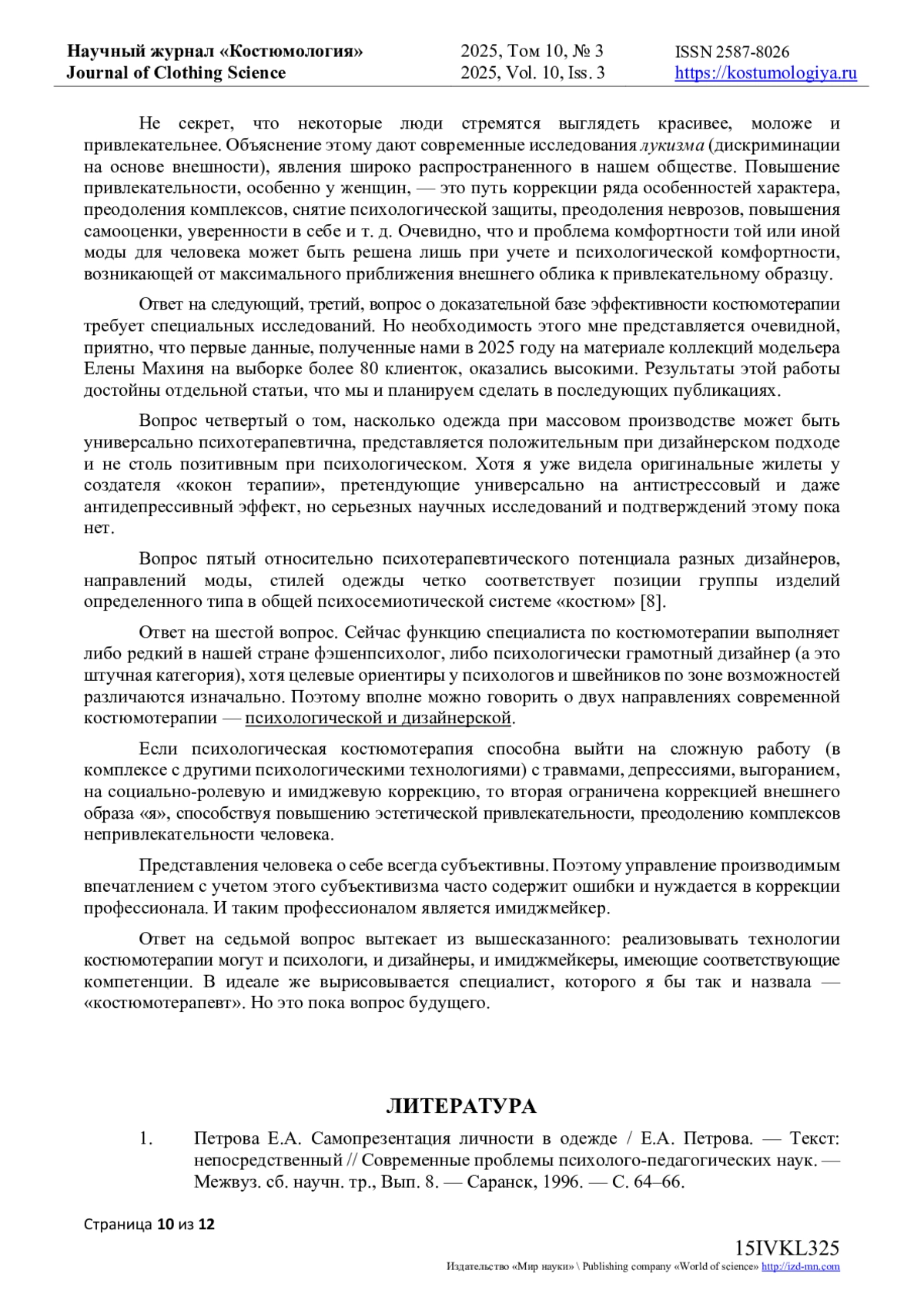 3. Петрова Е.А. Одежда и потребности человека / Е.А. Петрова, Е.А. Крючкова. - Текст: непосредственный // Современные технологии текстильной промышленности - М.: МГТА имени А.Н. Косыгина, 1996, - С. 106-108.