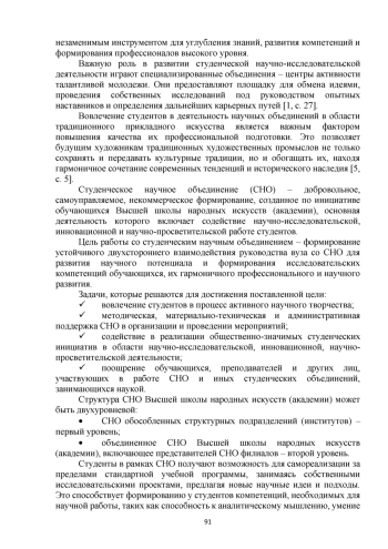 Студенты, члены СНО, участвуют в организации ежегодных научных мероприятий, проводимых в Высшей школе народных искусств (академии), г. Санкт-Петербург, выступают с докладами, содержанием которых является научно-исследовательская работа по разным направлениям обучения в вузе. Например, III Международный форум студентов, аспирантов, молодых ученых «Культура России в XXI веке: прошлое в настоящем, настоящее в будущем», который прошел 14-15 июня 2023 г. был посвящен обсуждению стратегии технико-технологического, регионально-исторического и художественно-эстетического развития видов традиционных художественных промыслов, которые обеспечат востребованность и узнаваемость этого искусства; Международный студенческий форум «Уникальное искусство России», посвященный 20-летнему юбилею Высшей школы народных искусств (академии) и 90-летнему юбилею Сергиево-Посадского института игрушки - филиала Высшей школы народных искусств (академии) на два дня (6-7 декабря 2023 г.) объединил молодых лидеров мнений, поддерживающих идеи и ценности традиционных художественных промыслов, стал дискуссионной площадкой молодежных инициатив и проектов, нацеленных на долгосрочный социально значимый эффект - развитие традиционных художественных промыслов.
