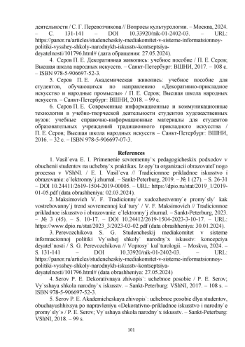 Статья посвящена осмыслению результатов аналитического обзора преподавания теории и истории традиционных художественных промыслов в вузах России в 2015 и 2023 гг. В рамках исследования был осуществлен сравнительный анализ учебных планов и рабочих программ дисциплин по направлению подготовки 54.03.02 Декоративно-прикладное искусство и народные промыслы в вузах Санкт-Петербурга, Москвы, Новосибирска, Екатеринбурга, Красноярска, Нижнего Новгорода. Автором раскрыта роль теоретических дисциплин в подготовке будущих художников; сформулирован потенциал курса теории и истории традиционных художественных промыслов; дан обзор основных изменений в системе народных художественных промыслов и профессиональном образовании в этой сфере в 2015-2023 гг., повлекшие пересмотр миссии и содержания обозначенного курса.