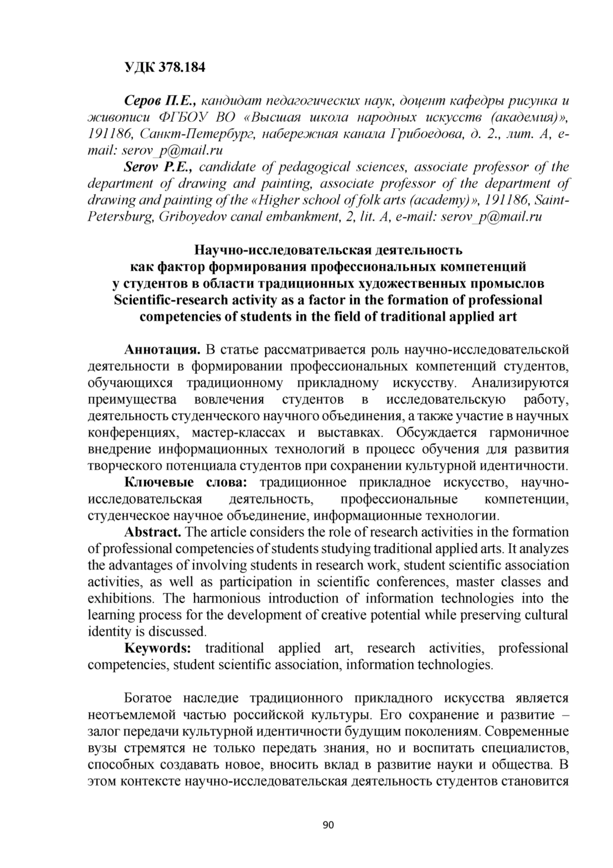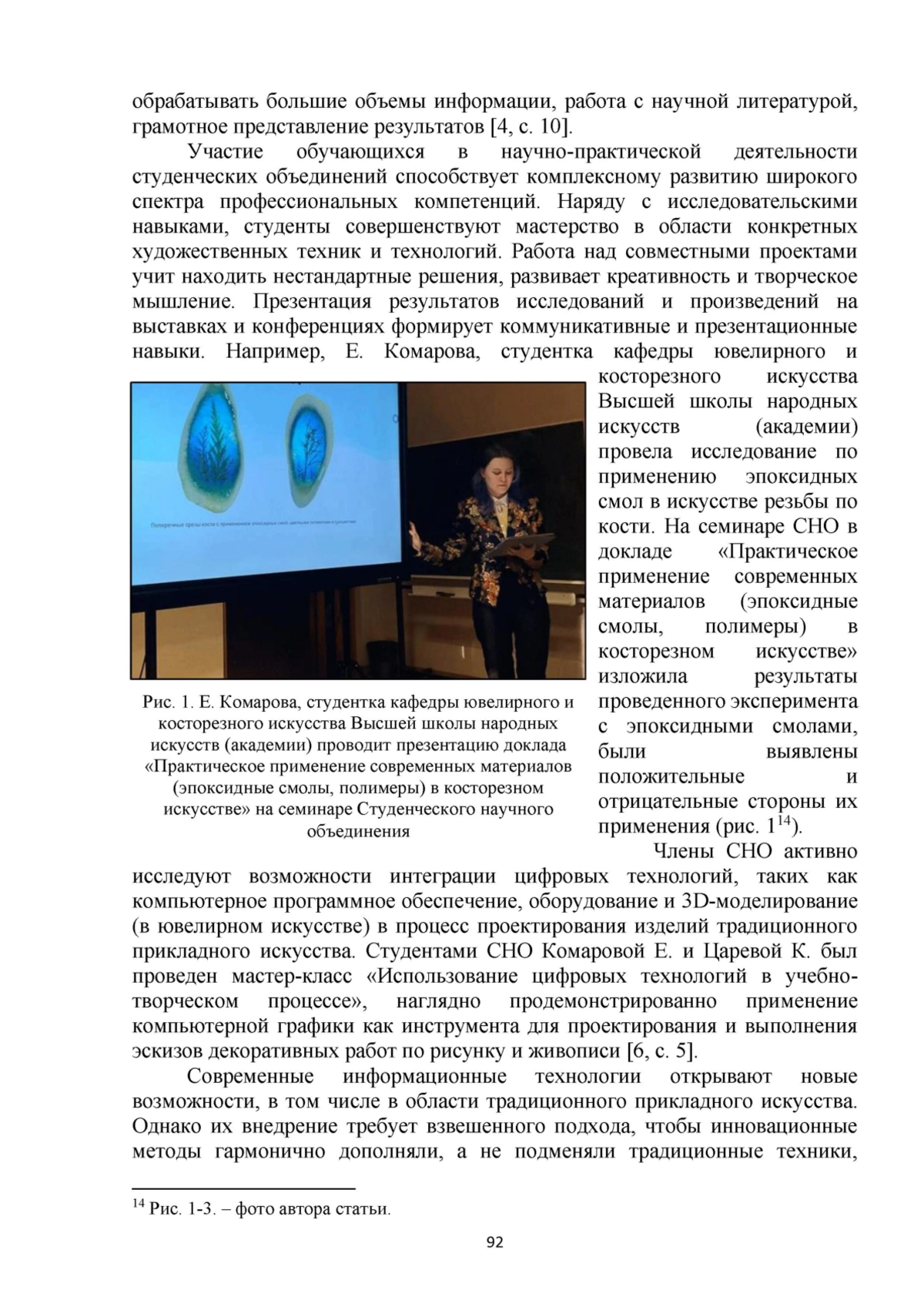 В статье рассматривается роль научно-исследовательской деятельности в формировании профессиональных компетенций студентов, обучающихся традиционному прикладному искусству. Анализируются преимущества вовлечения студентов в исследовательскую работу, деятельность студенческого научного объединения, а также участие в научных конференциях, мастер-классах и выставках. Обсуждается гармоничное внедрение информационных технологий в процесс обучения для развития творческого потенциала студентов при сохранении культурной идентичности.
