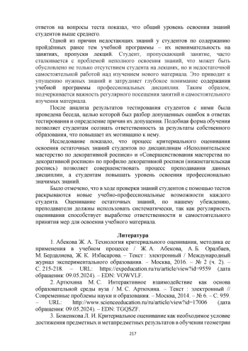 В Высшей школе народных искусств (академии) на кафедре декоративной росписи им А. Н. Голубевой (нижнетагильская роспись) среди студентов II-IV курсов было проведено критериальное формативное оценивание (тестирование), направленное на оценивание учебных достижений студентов и анализ освоения ими знаний по пройденным разделам профессиональных дисциплин для оценивания учебных достижений студентов. Цель исследования — повышение уровня процесса оценивания остаточных знаний по дисциплинам «Исполнительское мастерство по декоративной росписи» и «Совершенствование мастерства по декоративной росписи».