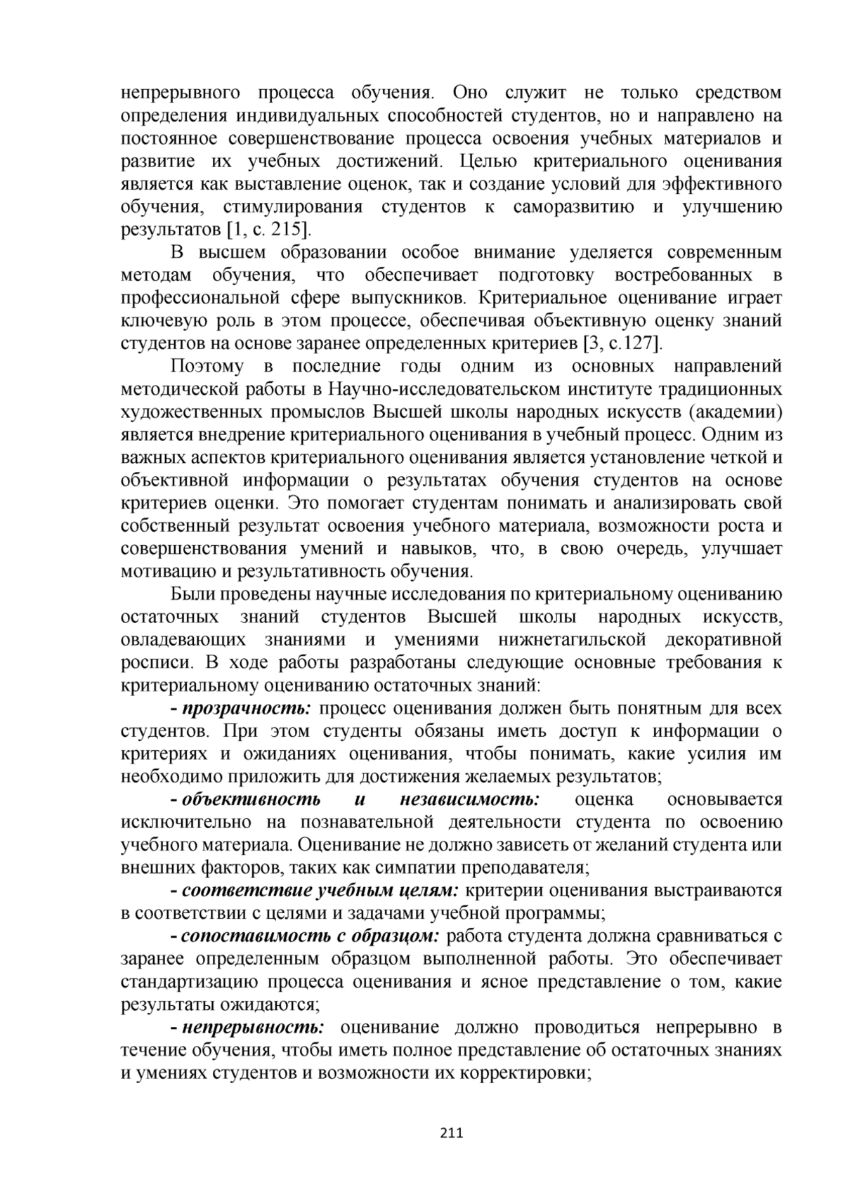 В статье представлены определение и задачи критериальной системы оценивания остаточных знаний студентов - будущих художников традиционных художественных промыслов. Исследованы содержание и виды критериального оценивания. Рассмотрены основные принципы и методы критериального оценивания, а также их практическое применение в области нижнетагильской декоративной росписи. Проанализировано, как критериальное оценивание способствует развитию компетенций студентов, улучшению качества образования и подготовке кадров. Приведена модель карты реализации критериального оценивания остаточных знаний студентов по дисциплинам «Исполнительское мастерство по декоративной росписи» и «Совершенствование мастерства по декоративной росписи».
