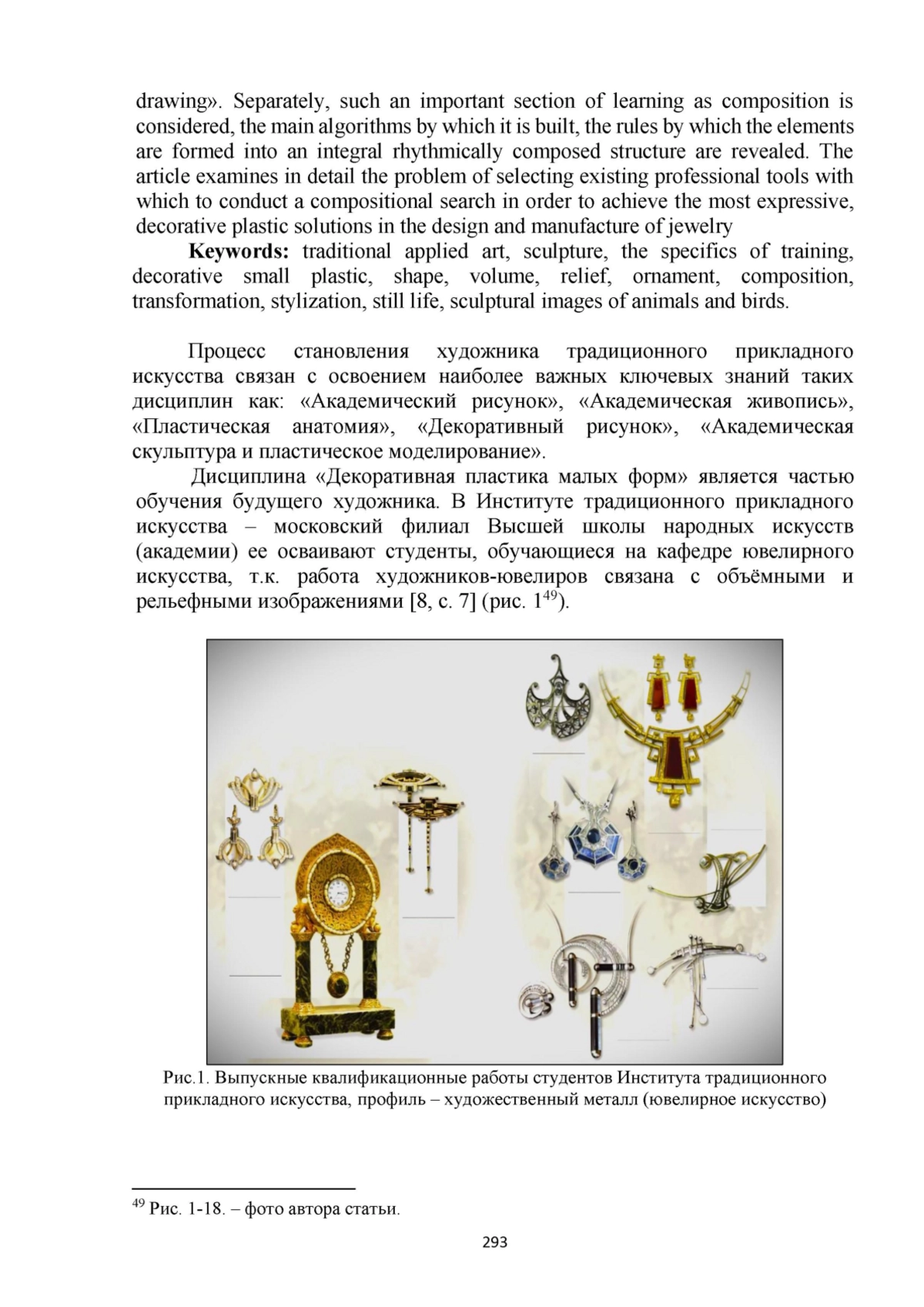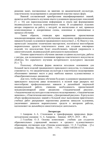Статья посвящена специфике преподавания академической скульптуры и декоративной пластики малых форм, будущим художникам традиционного прикладного искусства. В статье проведен детальный обзор учебных заданий по дисциплинам «Академическая скульптура и пластическое моделирование» и «Декоративная пластика малых форм». Особое внимание уделено взаимосвязи этих дисциплин, обоснована необходимость последовательного освоения этапов трансформации академической скульптурной формы в декоративную, логичной согласованности и взаимосвязи «Академического рисунка», «Пластической анатомии» и «Декоративного рисунка». Анализируется такой важнейший раздел содержания обучения, как композиция, раскрываются основные алгоритмы построения, правила, по которым элементы складываются в целостную составленную ритмически структуру. В статье подробно исследуется проблема отбора существующих профессиональных средств, с помощью которых ведется композиционный поиск наиболее выразительного пластически и декоративного решения в проектировании и изготовлении ювелирных изделий.
