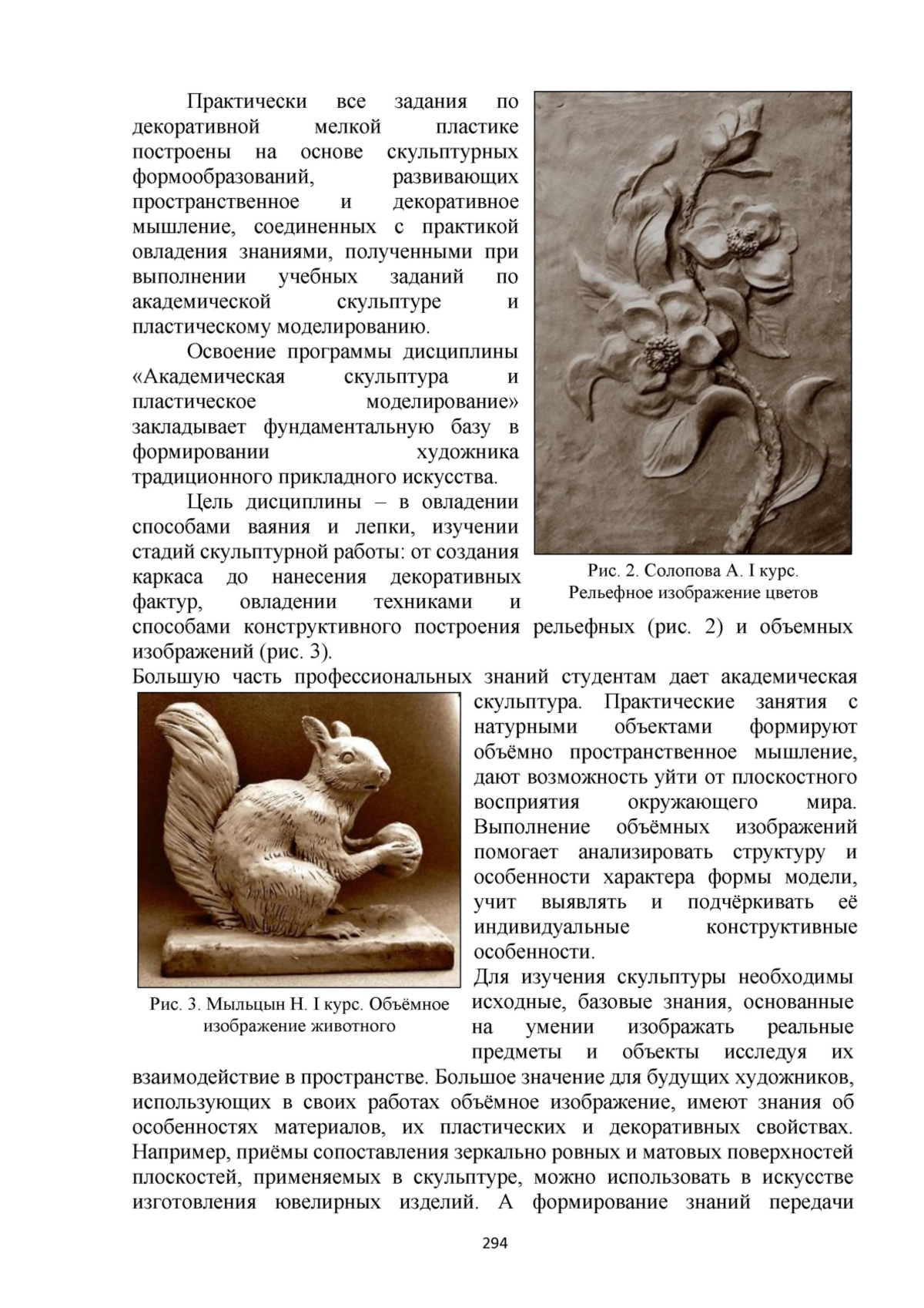 Выполнение академических заданий освоение дисциплины «Декоративная пластика малых форм». Практика и знания, приобретаемые в процессе работы над академическими заданиями, становятся примером профессионального подхода к решению сложных художественных задач с правильным практическим использованием приобретённых знаний в пластическом моделировании. Этот опыт способствует применению приёмов в работе по созданию пластических, декоративных произведений. На рисунках 10-11 представлены творческие работы студентов, выполненные на занятиях по декоративной пластике малых форм, в которых решаются декоративные задачи, основываясь на принципах построения академического рельефа, придавая композиционному замыслу условность свойственную произведениям декоративного искусства.