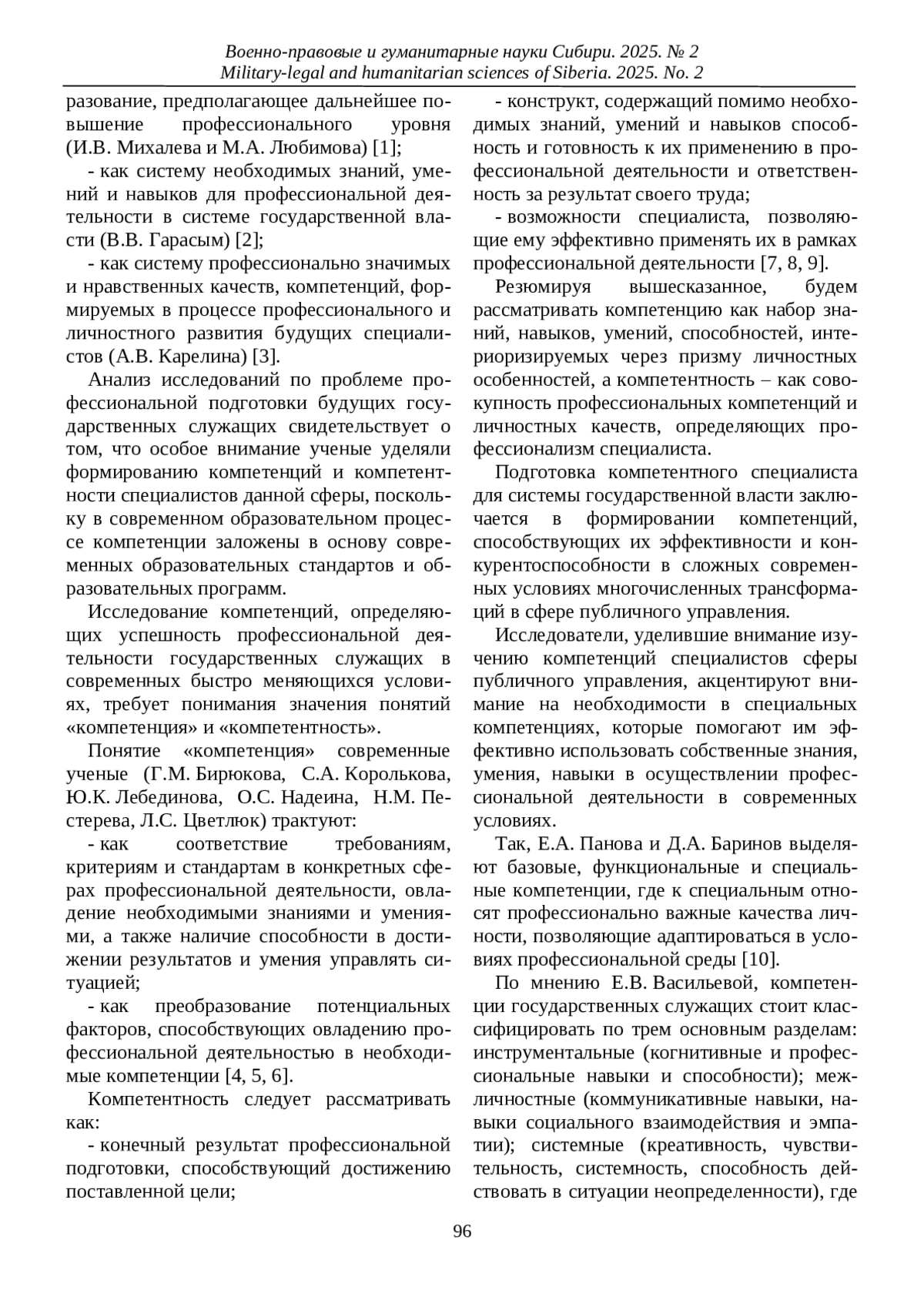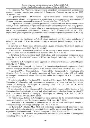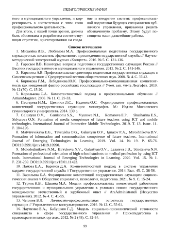 11. Васильева Е.А. Формирование компетенций государственных служащих: социологический анализ // Общество: социология, психология, педагогика. 2021. № 9. С. 15-24. EDN: VWCVYI