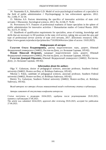 14. Науменко Е.А., Бабушкин Г.Д. Модель социально-психологической готовности специалиста в сфере государственного управления // Психопедагогика в правоохранительных органах. 2012. № 2 (49). С. 32-34. EDN: PFRBJH