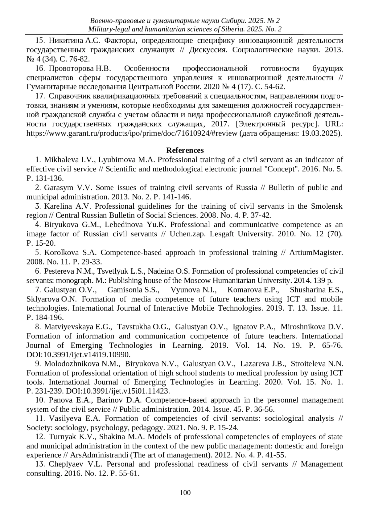 1. Михалёва И.В., Любимова М.А. Профессиональная подготовка государственного служащего как показатель эффективного прохождения государственной службы // Научно-методический электронный журнал “Концепт”. 2016. № 5. С. 131-136.