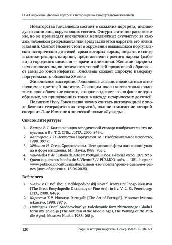 The article examines a masterpiece of early Portuguese painting, the polyptych of Nuno Gonçalves, a 15th-century artist. The preserved part of the polyptych consists of several wooden panels with images of Saint Vicente, Lisbon’s patron saint. Created during the Proto-Renaissance, the artwork aims to glorify the Age of Discovery, when the Portuguese were striving to build a new world empire. Gonçalves achieves remarkable skill in creating individual portraits, which posi tions him as a pioneer of early Portuguese portrait painting. His works serve as a testimony to the history of Portugal, its state and ethno-social structure. The artist’s talent is revealed in his innovative desire to realistically portray people belonging to different social classes and corporations, and in his striving to reflect their psychological depth rather than simply catch the physical appearance. At the same time, Gonsalves’ art is rich is symbolism, both offering insights into material culture subjects (clothes, costumes, weapons, books) and symbolically and emblematically outlining a deeper understanding of existence and genuine motives behind human actions.
