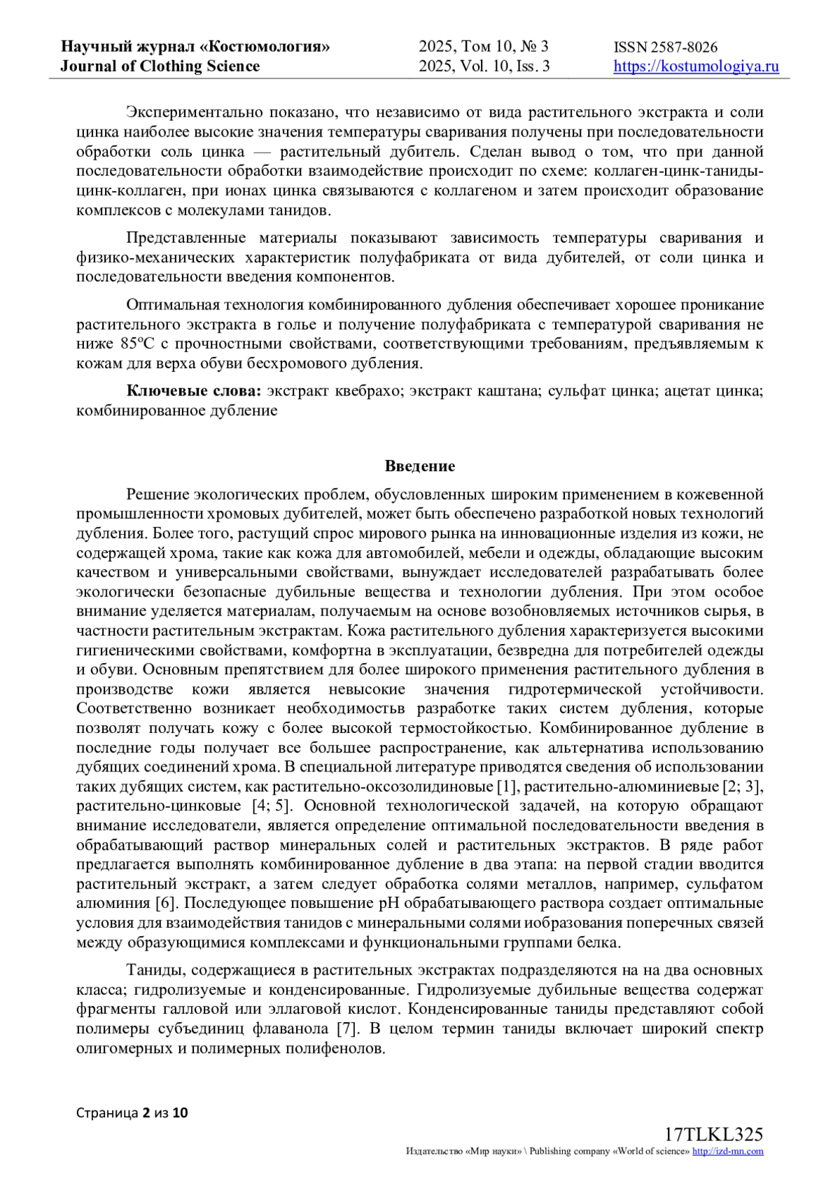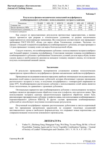 8. Lampard G.S., Covington A.D. Studies on semi-metal tanning. // Journal of the American Leather Chemists Association. 2004. V. 99. P. 502-509. EDN: XRHJGJ