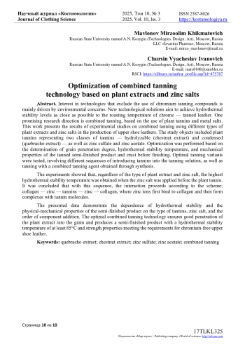 Интерес к технологиям, исключающим использование дубящих соединений хрома, обусловлен в основном экологическими проблемами. При этом новые технологические решения направлены на достижение показателей гидротермической устойчивости, по возможности близким к температуре сваривания кож хромового дубления. Одним из перспективных направлений исследования является комбинированное дубления, основанное на применении растительных дубителей и солей металлов. В данной работе представлены результаты экспериментальных исследований комбинированного дубления с использованием растительных экстрактов различного типа и солей цинка в производстве кож для верха обуви. В качестве объектов исследования использовали растительные дубители, представляющие два класса танидов - гидролизуемые (экстракт каштана) и конденсированные (экстракт квебрахо), а также сульфат цинка и ацетат цинка. Оптимизацию проводили на основе результатов по определению степени прокраса голья, температуре сваривания и механическим свойствам дубленого полуфабриката и краста перед отделкой. Отрабатывались оптимальные варианты дубления, предусматривающие различную последовательность введения дубителей в обрабатывающий раствор, а также дубление комбинированным дубителем, полученным в процессе синтеза. Экспериментально показано, что независимо от вида растительного экстракта и соли цинка наиболее высокие значения температуры сваривания получены при последовательности обработки соль цинка - растительный дубитель. Сделан вывод о том, что при данной последовательности обработки взаимодействие происходит по схеме: коллаген-цинк-таниды-цинк-коллаген, при ионах цинка связываются с коллагеном и затем происходит образование комплексов с молекулами танидов. Представленные материалы показывают зависимость температуры сваривания и физико-механических характеристик полуфабриката от вида дубителей, от соли цинка и последовательности введения компонентов. Оптимальная технология комбинированного дубления обеспечивает хорошее проникание растительного экстракта в голье и получение полуфабриката с температурой сваривания не ниже 85оС с прочностными свойствами, соответствующими требованиям, предъявляемым к кожам для верха обуви бесхромового дубления.