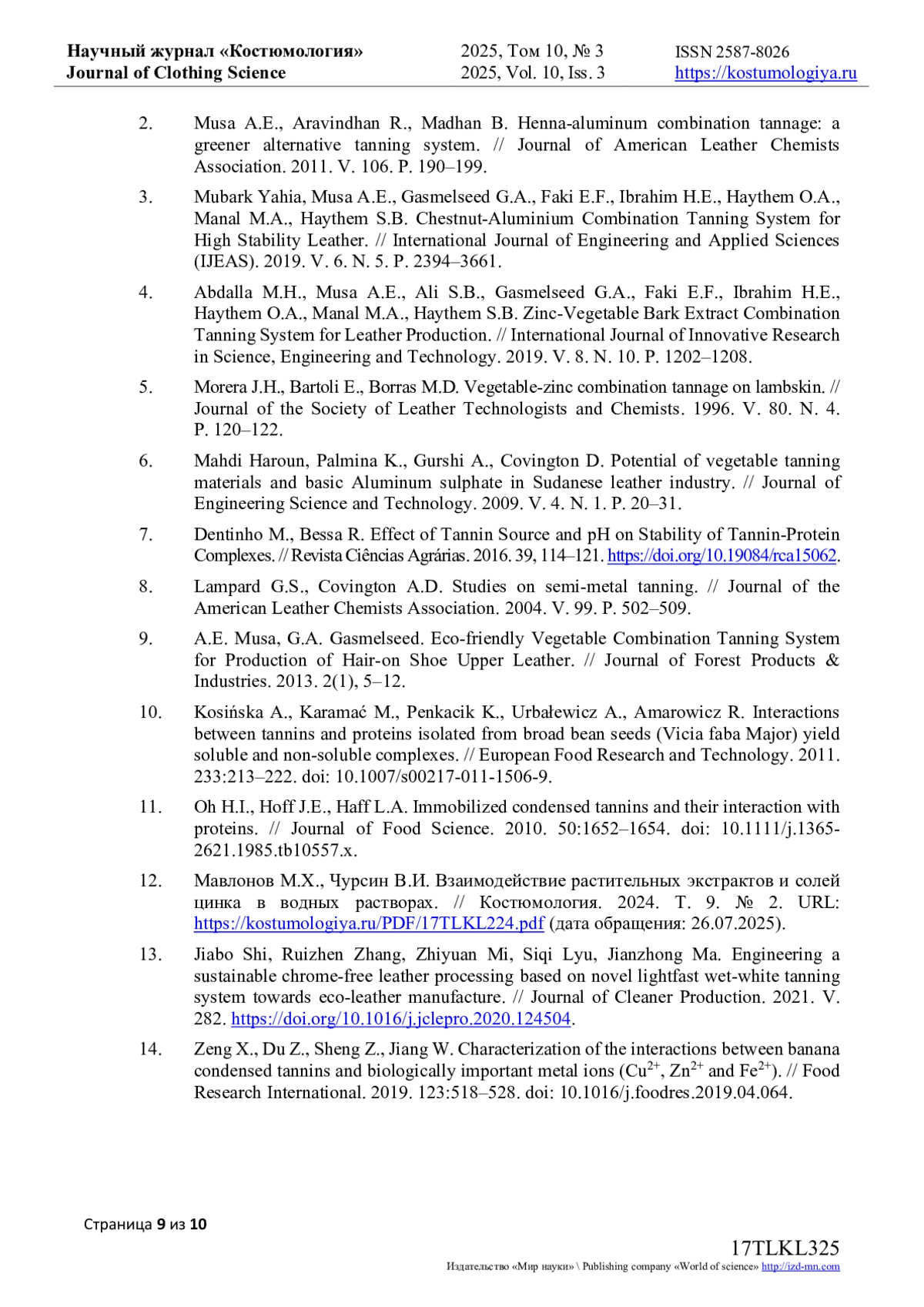 9. A.E. Musa, G.A. Gasmelseed. Eco-friendly Vegetable Combination Tanning System for Production of Hair-on Shoe Upper Leather. // Journal of Forest Products & Industries. 2013. 2(1), 5-12.