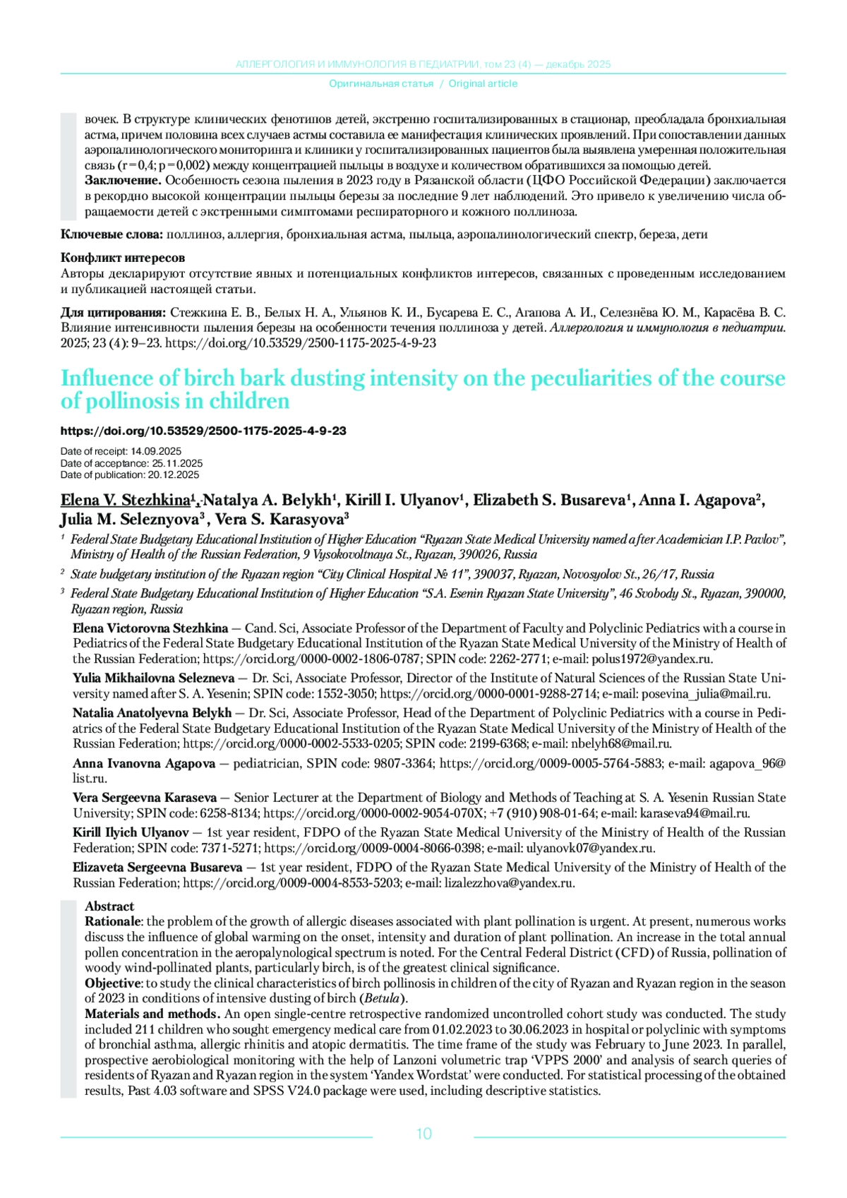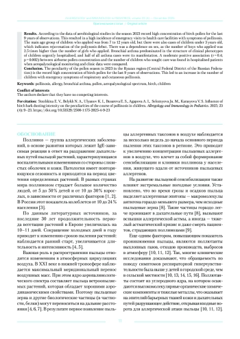 Заключение. Особенность сезона пыления в 2023 году в Рязанской области (ЦФО Российской Федерации) заключается в рекордно высокой концентрации пыльцы березы за последние 9 лет наблюдений. Это привело к увеличению числа обращаемости детей с экстренными симптомами респираторного и кожного поллиноза.