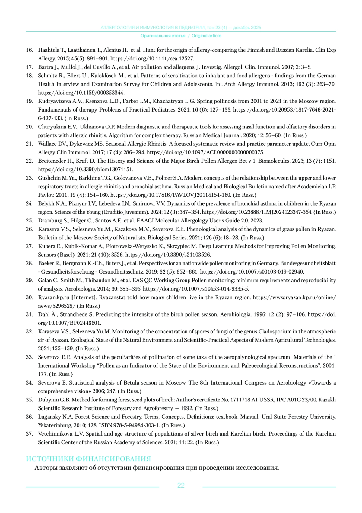 19. Кудрявцева А.В., Ксензова Л.Д., Фарбер И.М., Хачатрян Л.Г. Весенний поллиноз в период с 2001 по 2021 гг. в Московском регионе. Основы терапии. Вопросы практической педиатрии. 2021; 16 (6): 127-133. DOI: 10.20953/1817-7646-2021-6-127-133