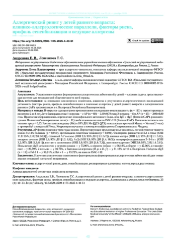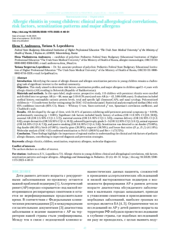 АНДРОНОВА Е. В., ЛЕПЕШКОВА Т. С. АЛЛЕРГИЧЕСКИЙ РИНИТ У ДЕТЕЙ РАННЕГО ВОЗРАСТА: КЛИНИКО-АЛЛЕРГОЛОГИЧЕСКИЕ ПАРАЛЛЕЛИ, ФАКТОРЫ РИСКА, ПРОФИЛЬ СЕНСИБИЛИЗАЦИИ И ВЕДУЩИЕ АЛЛЕРГЕНЫ // АЛЛЕРГОЛОГИЯ И ИММУНОЛОГИЯ В ПЕДИАТРИИ. 2025. № 4, ТОМ 23