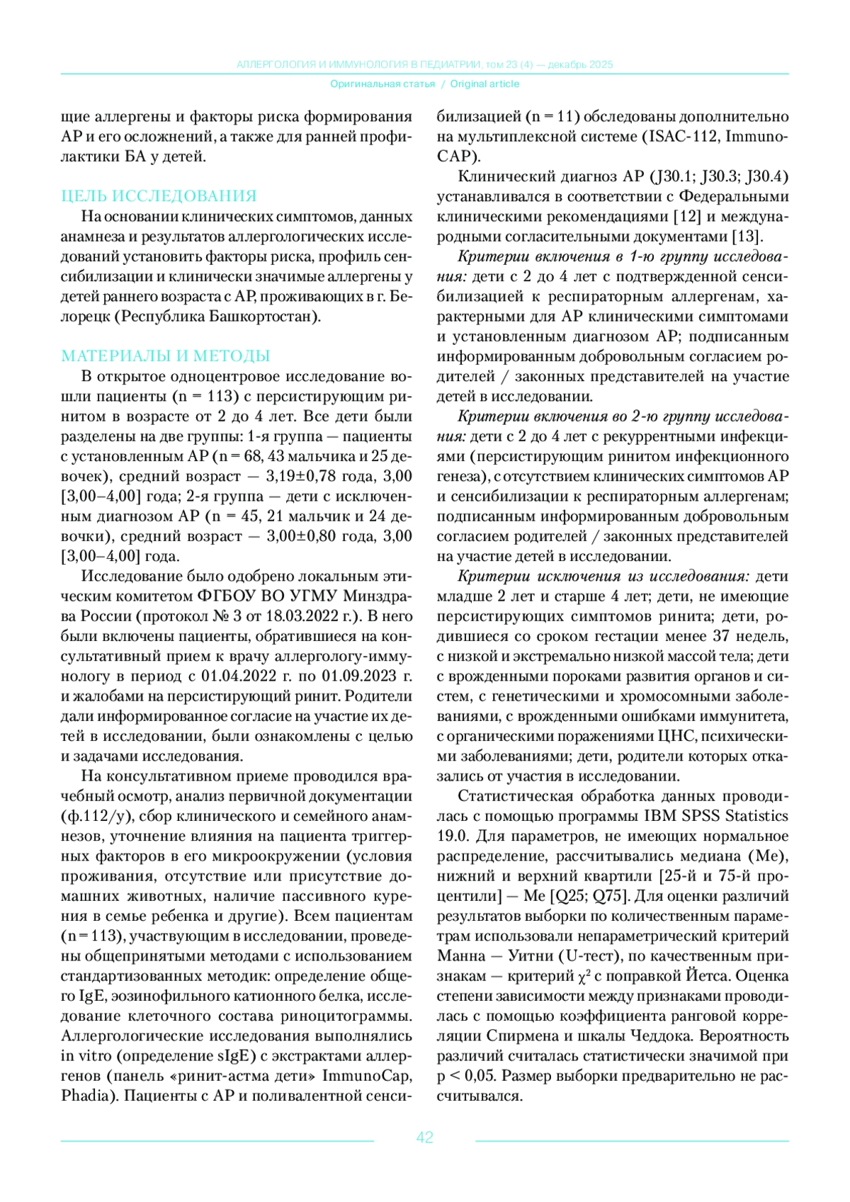 Материалы и методы. В открытое одноцентровое проспективное исследование вошли пациенты (n = 113) с персистирующим ринитом с 2 до 4 лет. Дети были разделены: 1-я группа — с АР (n = 68) — 3,19±0,78 года; 2-я группа — без АР (n = 45) — 3,00±0,80 года. Проведены: сбор анамнезов, определение эозинофильного катионного белка, общ IgE и sIgE (ImmunoCAP), риноцитограмма. Полисенсибилизированные дети (n = 11) дообследованы на панели ISAC-112 (ImmunoCAP). Различия считались значимыми при р < 0,05. Рассчитывали медиану (Ме) и 95% ДИ: Me [Q25; Q75], использовали критерий Манна — Уитни (U-тест) и критерий χ2 с поправкой Йетса. Корреляции изучались с помощью коэффициента Спирмена и шкалы Чеддока.