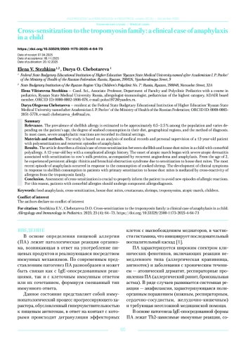 Результат. В статье описан клинический случай перекрестной сенсибилизации между ракообразными и клещами домашней пыли у ребенка с коморбидной полиаллергией. Мальчик 12 лет с отягощенным аллергологическим анамнезом. Старт атопического марша с тяжелого атопического дерматита, связанный с сенсибилизацией к белкам коровьего молока, с рецидивирующими ангиоотеками и анафилаксией. С 2 лет — персистирующий аллергический ринит и бронхообструктивный синдром при сенсибилизации к клещам домашней пыли. Последний эпизод анафилаксии возник в ответ на употребление вареной креветки. Развитие клинических симптомов в ответ на употребление ракообразных у пациентов с первичной сенсибилизацией к клещам домашней пыли опосредовано перекрестной реактивностью аллергенов семейства тропомиозинов.