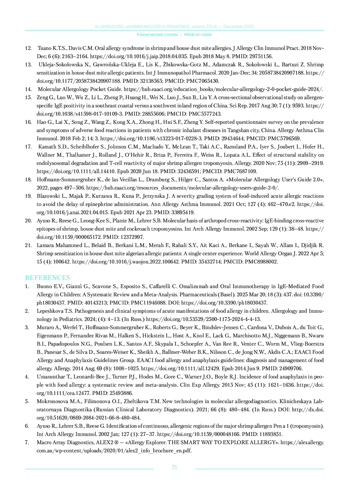 1. Buono E.V., Giannì G., Scavone S., Esposito S., Caffarelli C. Omalizumab and Oral Immunotherapy in IgE-Mediated Food Allergy in Children: A Systematic Review and a Meta-Analysis. Pharmaceuticals (Basel). 2025 Mar 20; 18 (3): 437. 10.3390/ph18030437. PMID: 40143213; PMCID: PMC11946088. 10.3390/ph18030437. DOI: 10.3390/ph18030437.;PMCID PMID: 40143213