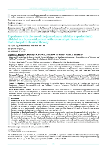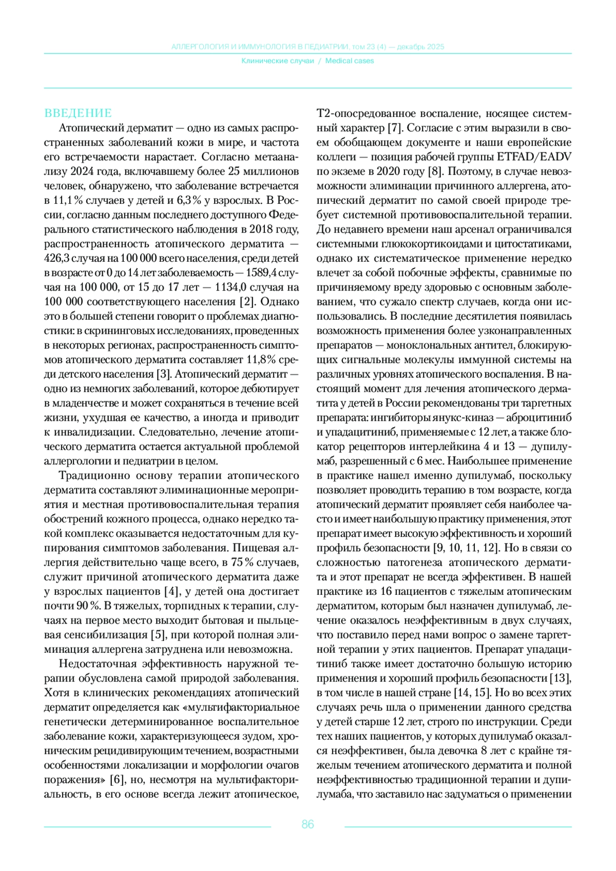 Введение. Атопический дерматит (АтД) — одно из самых распространенных заболеваний кожи в мире, и частота его встречаемости нарастает. Это одно из немногих заболеваний, которое дебютирует в младенчестве и может сохраняться в течение всей жизни, ухудшая ее качество, а иногда и приводит к инвалидизации. Следовательно, лечение атопического дерматита остается актуальной проблемой аллергологии и педиатрии в целом. Традиционно основу терапии атопического дерматита составляют элиминационные мероприятия и местная противовоспалительная терапия обострений кожного процесса, однако нередко такой комплекс оказывается недостаточным для купирования симптомов заболевания, что приводит к необходимости и спользовать таргетную терапию моноклинальными антителами, в том числе в некоторых случаях упадацитиниба.