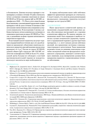 5. Глухова Е.А., Тамразова О.Б., Ревякина В.А., Сухотина А.Г. Спектр сенсибилизации у больных атопическим дерматитом в зависимости от степени тяжести. Практика педиатра. 2023; 4: 20-24.