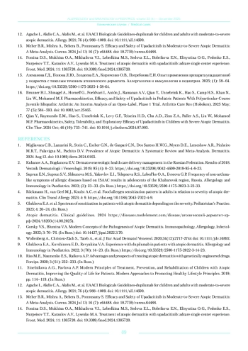 9. Глухова Е.А., Кувшинова Е.Д., Ревякина В.А. Опыт применения дупилумаба у пациентов с тяжелым атопическим дерматитом. Аллергология и иммунология в педиатрии. 2022; 3 (70): 14-23.