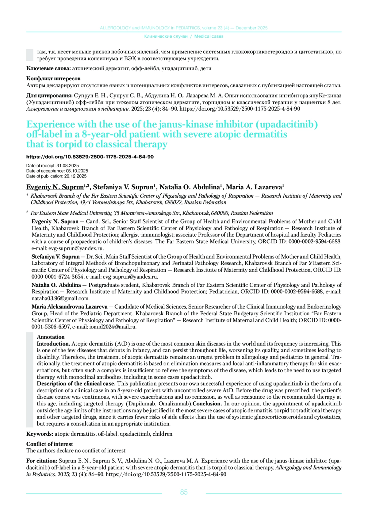 17. Qian Y., Raymundo E.M., Hao S., Unnebrink K., Levy G.F., Teixeira H.D., Chu A.D., Zinn Z.A., Paller A.S., Liu W., Mohamed M.F. Pharmacokinetics, Safety, Tolerability, and Exploratory Efficacy of Upadacitinib in Children with Severe Atopic Dermatitis. Clin Ther. 2024 Oct; 46 (10): 733-741. DOI: 10.1016/j.clinthera.2024.07.003