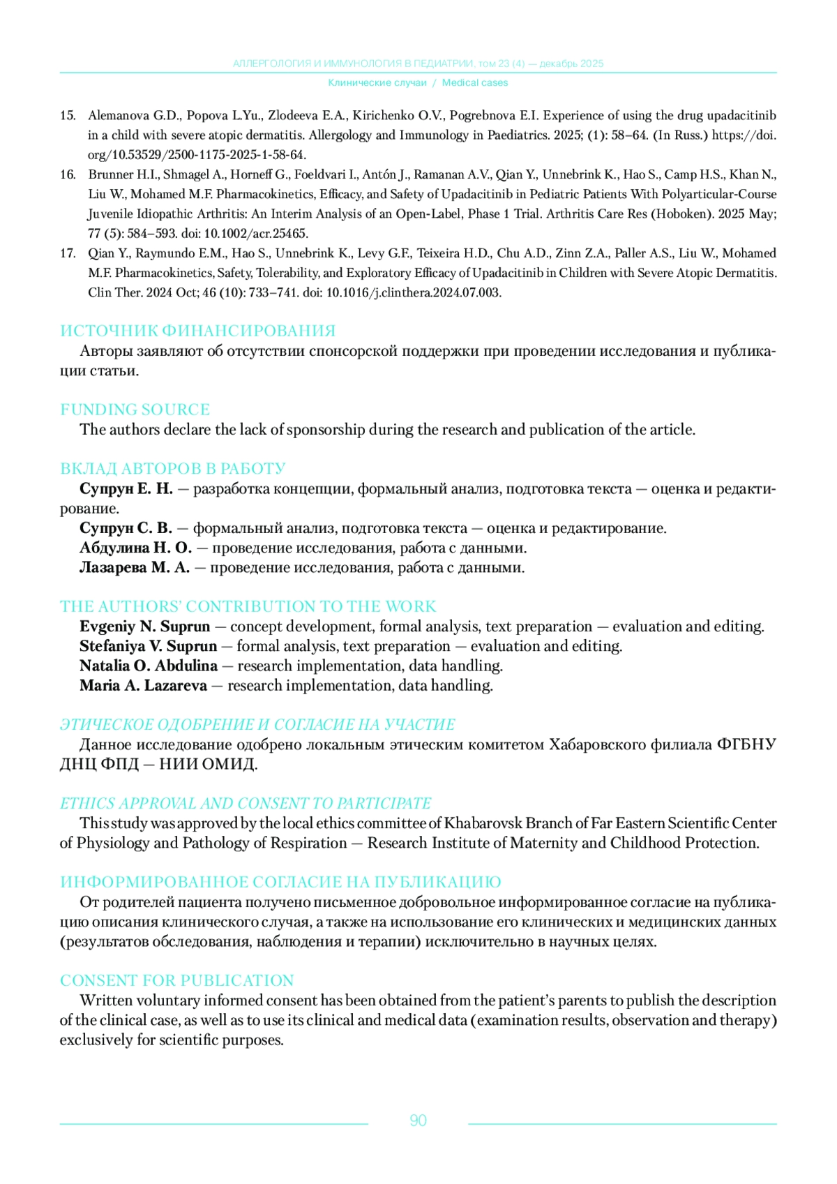 15. Алеманова Г.Д., Попова Л.Ю., Злодеева Е.А., Кириченко О.В., Погребнова Е.И. Опыт применения препарата упадацитиниб у подростка с тяжелым течением атопического дерматита. Аллергология и иммунология в педиатрии. 2025; (1): 58-64. DOI: 10.53529/2500-1175-2025-1-58-64