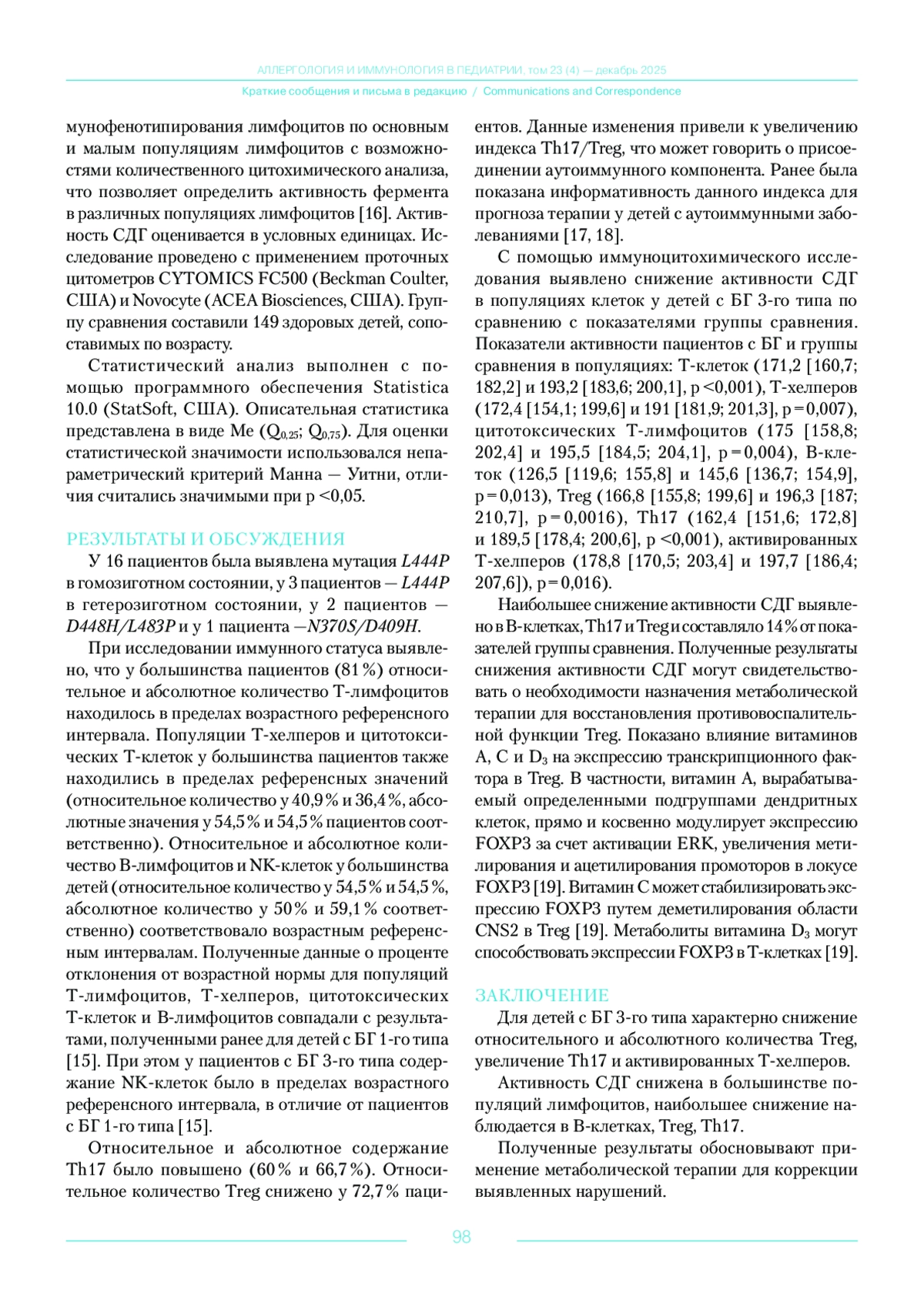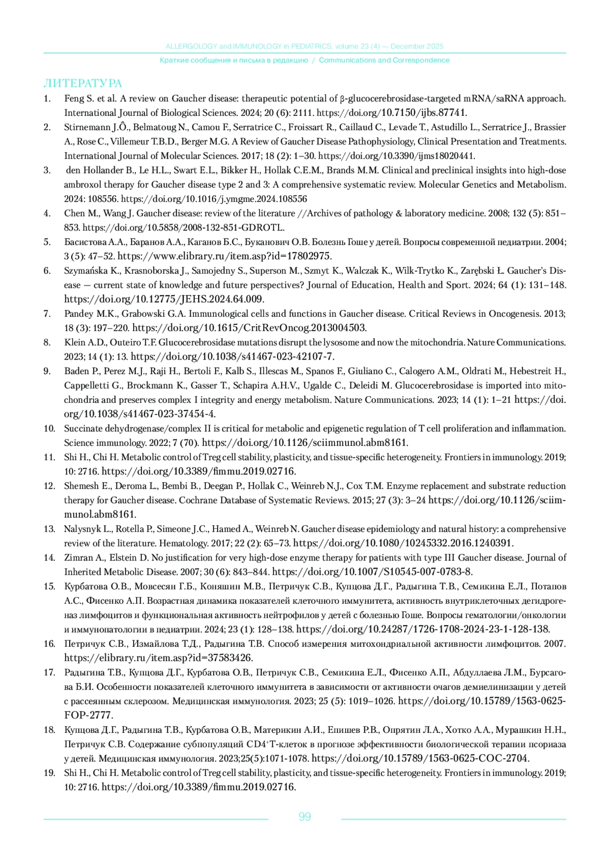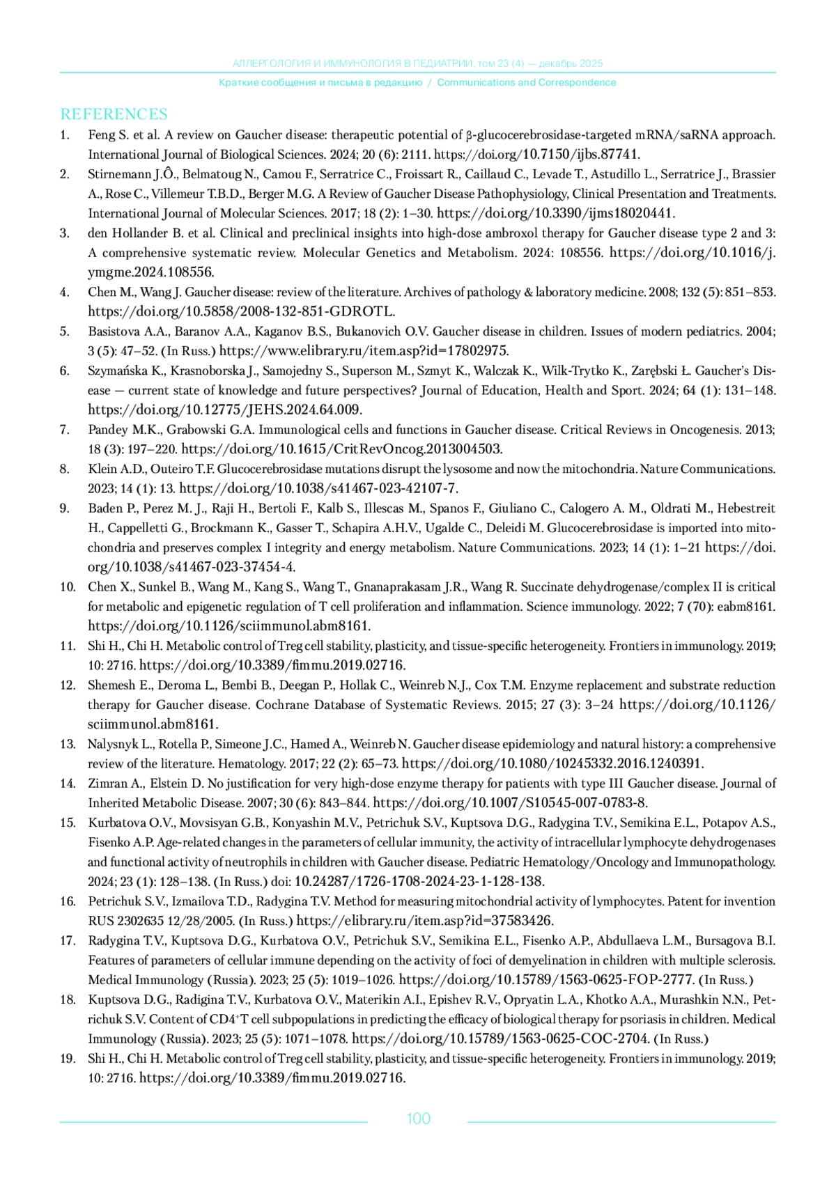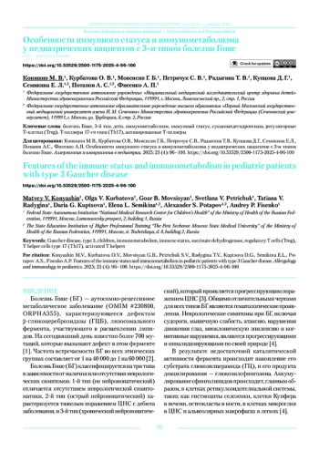 15. Курбатова О.В., Мовсесян Г.Б., Коняшин М.В., Петричук С.В., Купцова Д.Г., Радыгина Т.В., Семикина Е.Л., Потапов А.С., Фисенко А.П. Возрастная динамика показателей клеточного иммунитета, активность внутриклеточных дегидрогеназ лимфоцитов и функциональная активность нейтрофилов у детей с болезнью Гоше. Вопросы гематологии/онкологии и иммунопатологии в педиатрии. 2024; 23 (1): 128-138. DOI: 10.24287/1726-1708-2024-23-1-128-138