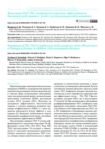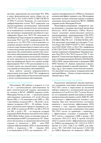 6. Петричук С.В., Мирошкина Л.В., Семикина Е.Л.,Топтыгина А.П., Потапов А.С., Цимбалова Е.Г., Радыгина Т.В Показатели популяционного состава лимфоцитов как предикторы эффективности терапии ингибитором TNFα у детей с воспалительными заболеваниями кишечника. Медицинская иммунология. 2018; 20 (5): 721-730. DOI: 10.15789/1563-0625-2018-5-721-730