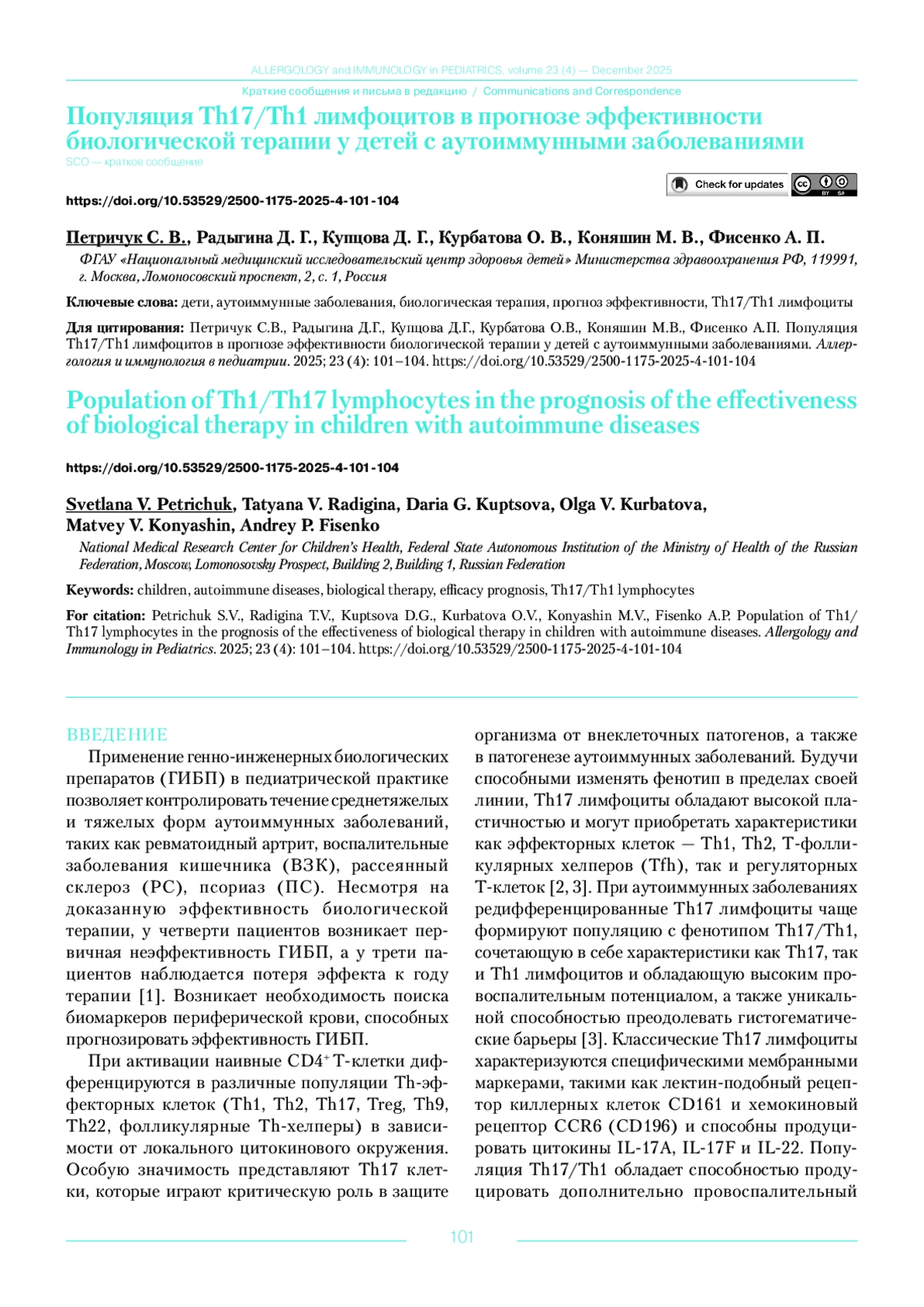 8. Купцова Д.Г., Радыгина Т.В., Курбатова О.В., Материкин А.И., Епишев Р.В., Опрятин Л.А., Хотко А.А., Мурашкин Н.Н., Петричук С.В. Содержание субпопуляций СD4+Т-клеток в прогнозе эффективности биологической терапии псориаза у детей. Медицинская иммунология 2023; 25 (5): 1071-1078. DOI: 10.15789/1563-0625-COC-2704