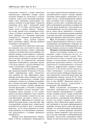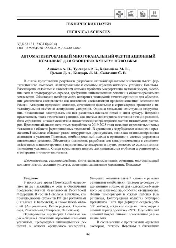 В статье представлены результаты разработки автоматизированного многоканального фертигационного комплекса, адаптированного к сложным агроклиматическим условиям Поволжья. Рассмотрены связанные с изменением климата проблемы макрорегиона, включая засухи, засоление почв и температурные стрессы, требующие инновационных решений в области орошаемого земледелия. Обоснована необходимость внедрения технологий точного орошения для обеспечения устойчивого овощеводства как важнейшей составляющей продовольственной безопасности России. Авторами предложен комплекс, сочетающий капельное и спринклерное орошение с интеллектуальной системой дозирования удобрений. Описана модульная конструкция оборудования, позволяющая адаптировать его под различные площади полей и типы культур. Подробно представлены такие технические решения, как система мониторинга состояния почвы и растений, блок управления, а также механизмы автоматической корректировки состава питательных растворов. Проведенный анализ патентных разработок за 2019-2025 годы позволил определить мировые тенденции в области фертигационных технологий. В сравнении с зарубежными аналогами предлагаемый комплекс обладает рядом конкурентных преимуществ, таких как специализированная адаптация к условиям Поволжья, комбинированный подход к орошению и система управления питательным режимом. Обоснована значимость разработки для импортозамещения в сельскохозяйственном машиностроении и перспективы ее внедрения в других регионах со схожими климатическими условиями. Статья представляет интерес для специалистов в области агроинженерии, мелиорации и точного земледелия.