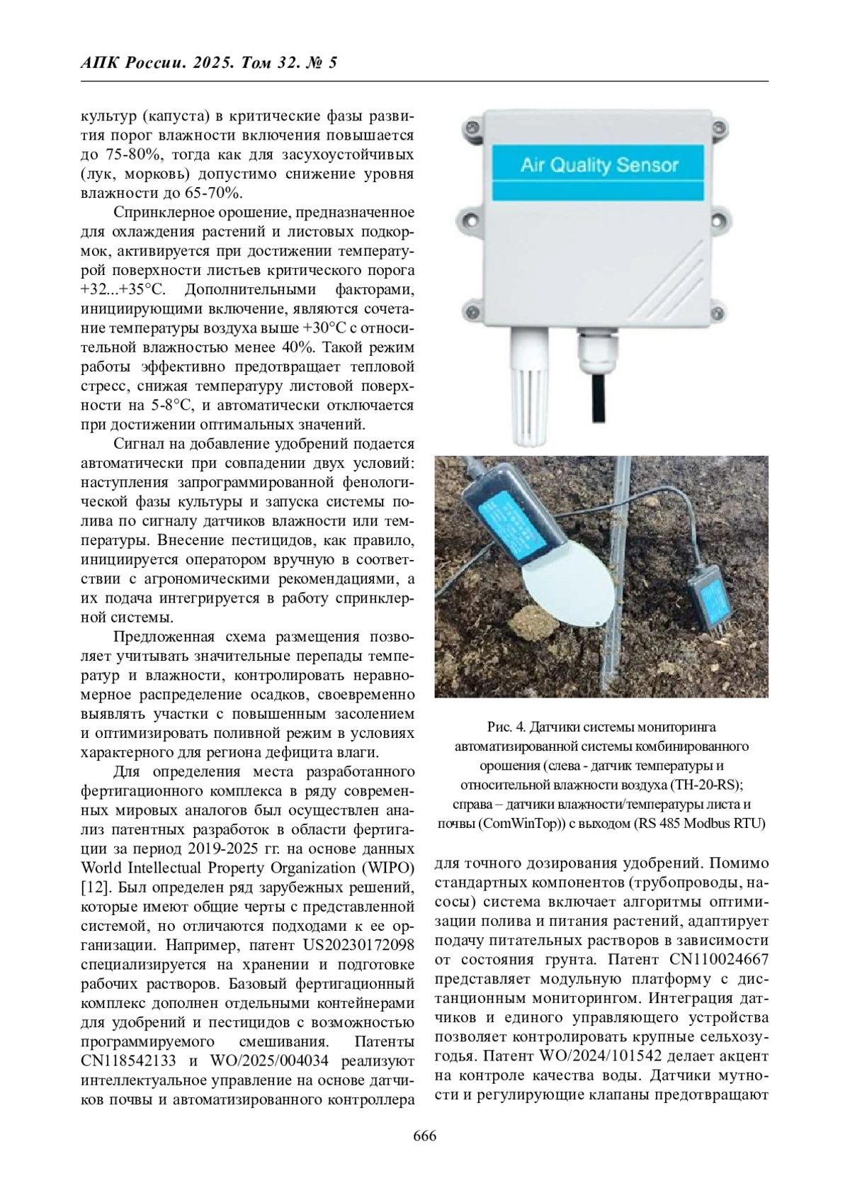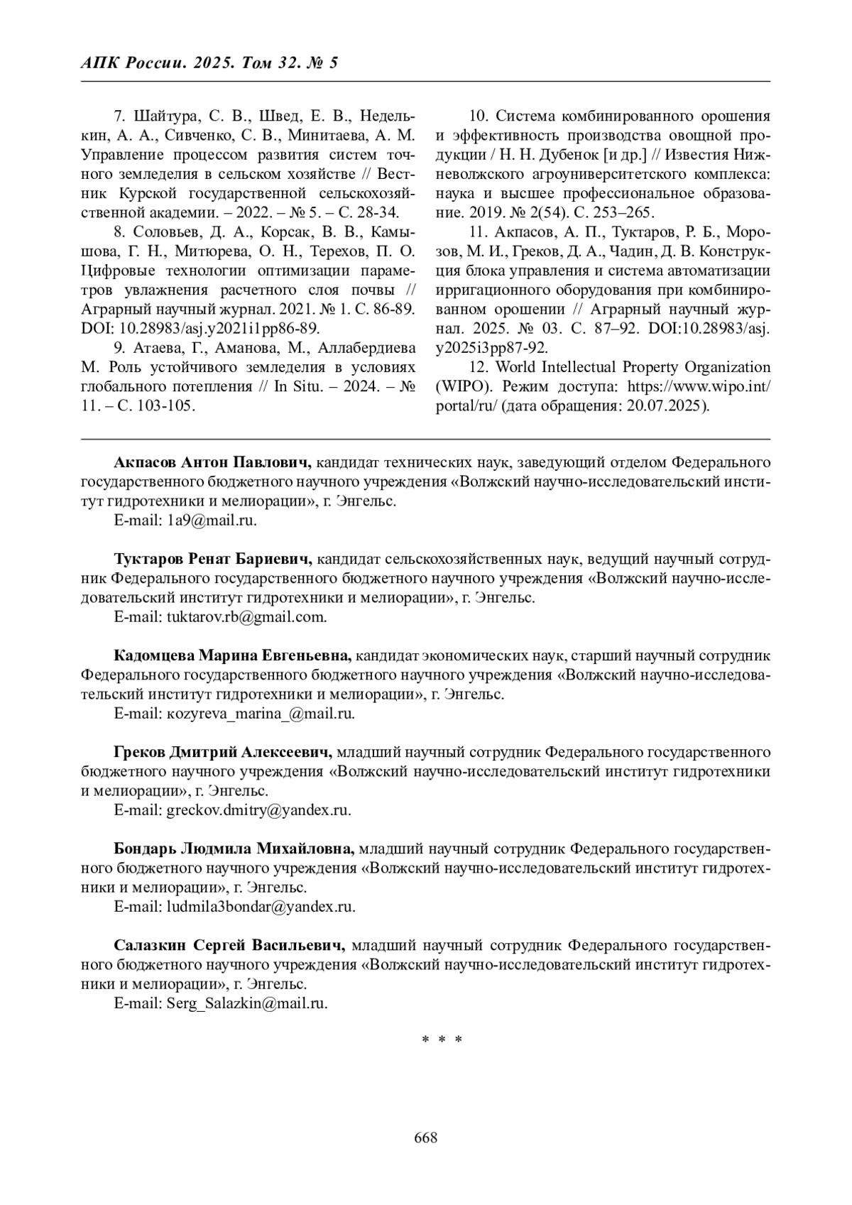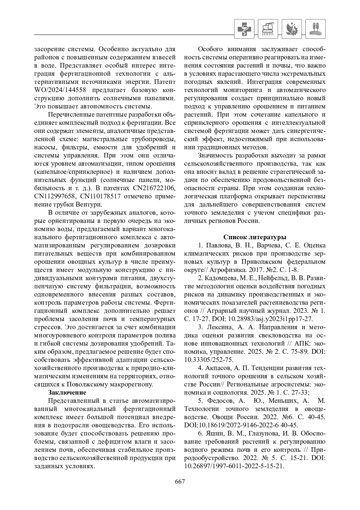 4. Акпасов, А. П. Тенденции развития технологий точного орошения в сельском хозяйстве России// Региональные агросистемы: экономика и социология. 2025. № 1. С. 27-33.