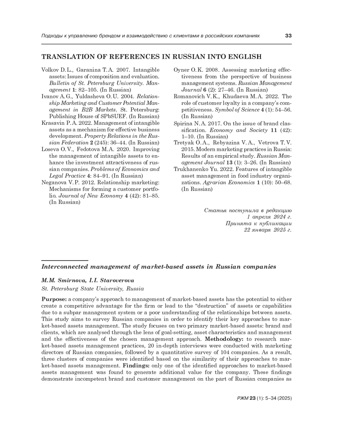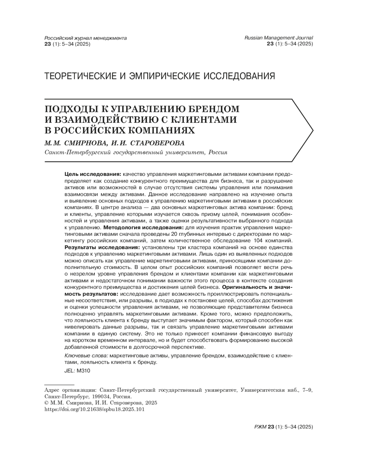 Цель исследования: качество управления маркетинговыми активами компании предопределяет как создание конкурентного преимущества для бизнеса, так и разрушение активов или возможностей в случае отсутствия системы управления или понимания взаимосвязи между активами. Данное исследование направлено на изучение опыта и выявление основных подходов к управлению маркетинговыми активами в российских компаниях. В центре анализа - два основных маркетинговых актива компании: бренд и клиенты, управление которыми изучается сквозь призму целей, понимания особенностей и управления активами, а также оценки результативности выбранного подхода к управлению.