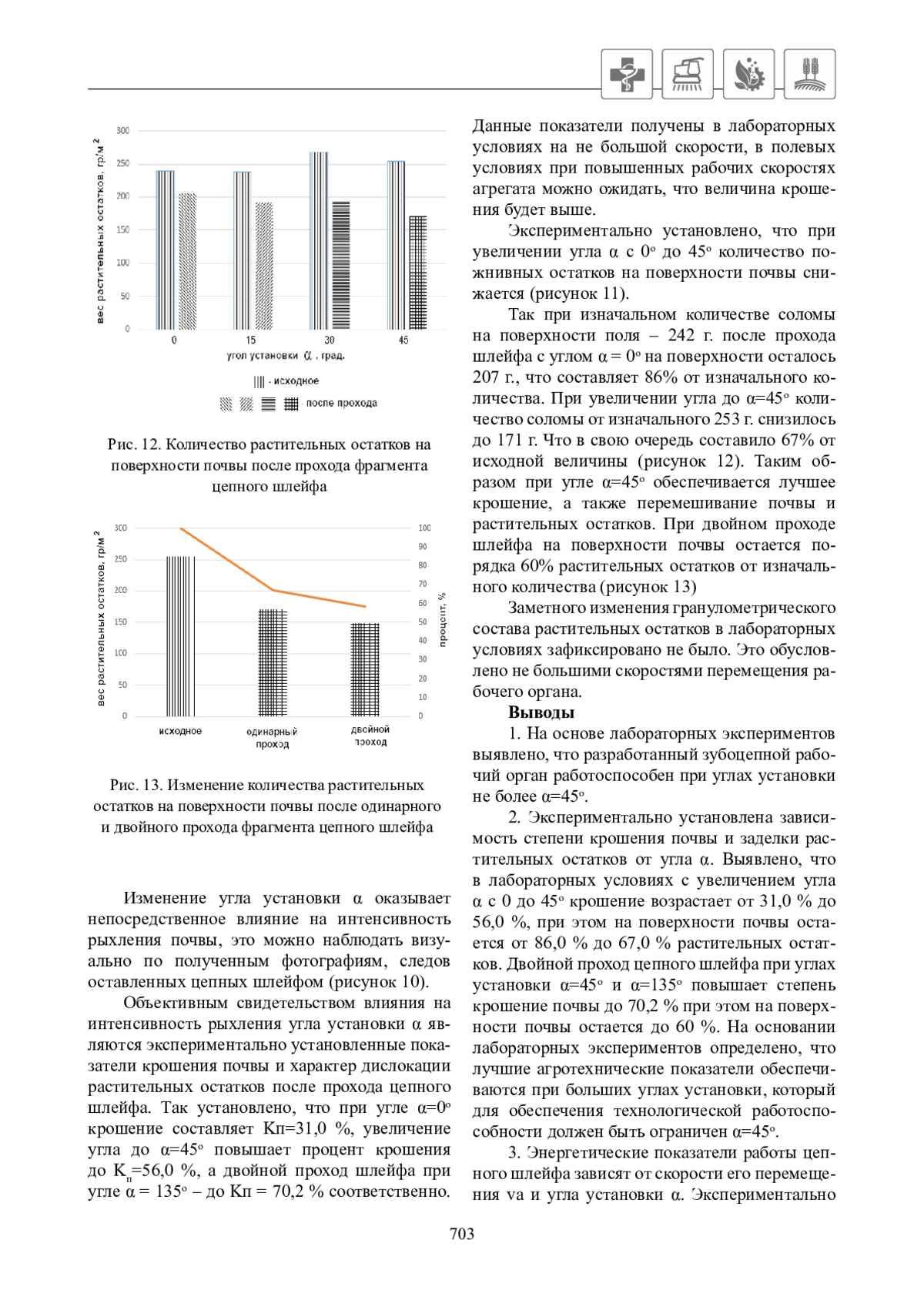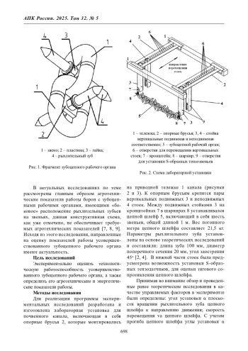 Предложена усовершенствованная конструкция зубоцепного рабочего органа, который имеет «центральное» расположение рыхлительного зуба на звеньях. Модернизация рабочего органа призвана обеспечить большую глубину обработки и лучшую интенсивность рыхления почвы. Описана методика лабораторных экспериментов и приборное оснащение. Разработана и изготовлена лабораторная установка для экспериментальных исследований в почвенном канале. Установка позволяет производить оценку агротехнических и энергетических показателей работы зубоцепного рабочего органа при изменении скорости его перемещения и угла установки к направлению движения. Исходя из результатов предварительных теоретических исследований и возможностей экспериментального оборудования управляемые факторы варьировались в следующих диапазонах: угол установки плоскости вращения рыхлительного зуба цепного шлейфа к направлению движения – 0…45o; скорость – 0,5…1,5 м/с. Экспериментально определялись следующие агротехнические показатели: глубина обработки, крошение; дислокация растительных остатков нп поверхности почвы. Также определено тяговое сопротивление экспериментального рабочего органа длиной 1м. В ходе исследований установлен диапазон изменений угла установки цепного шлейфа, при которых сохраняется его технологическая работоспособность. Выявлено, что лучшее крошение почвы в лабораторных условиях осуществляется после вторичного прохода зубоцепного рабочего органа при углах его установки 45o. При этом также выявлено, что большие углы установки цепного шлейфа обеспечивают более интенсивное рыхление почвы и ее перемешивание с растительными остатками. На величину тягового сопротивления оказывают влияние скорость движения цепного шлейфа и угол. В рассматриваемых интервалах варьирования управляемых факторов тяговое сопротивление цепного шлейфа длиной 1 м изменяется в диапазоне от 62,0 Н до 223,0 Н.