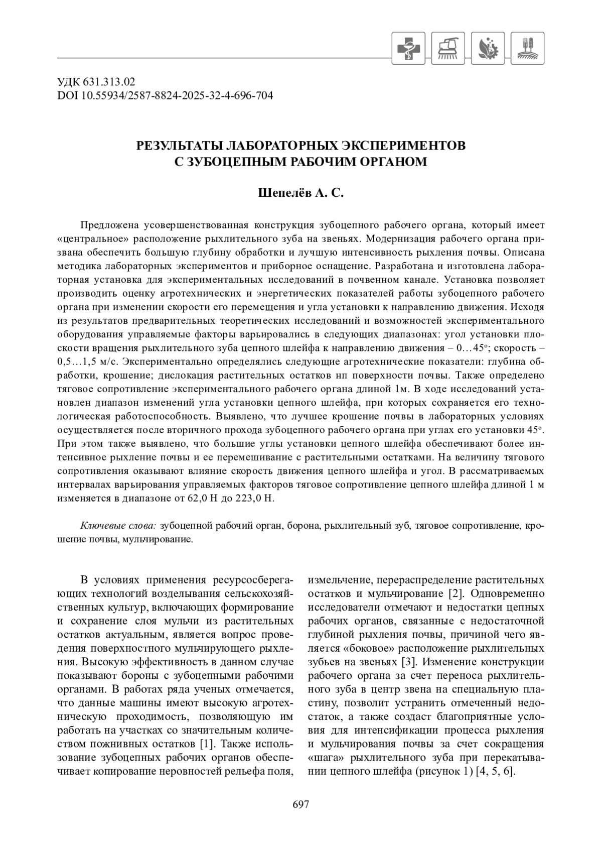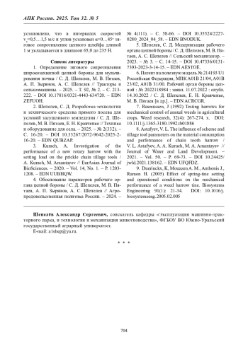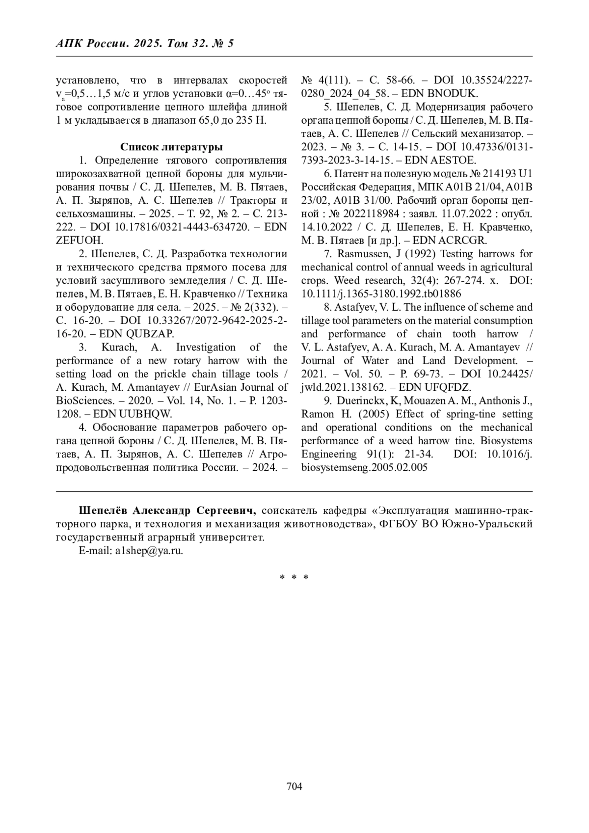 1. Определение тягового сопротивления широкозахватной цепной бороны для мульчирования почвы / С. Д. Шепелев, М. В. Пятаев, А. П. Зырянов, А. С. Шепелев // Тракторы и сельхозмашины. - 2025. - Т. 92, № 2. - С. 213-222. DOI: 10.17816/0321-4443-634720