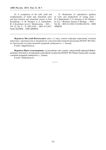 25. Realization of reproductive qualities of cows and productivity of young stock / D. A. Baimukanov, V. G. Semenov, A. M. Ombayev [et al.] // Brazilian Journal of Biology. - 2024. - Vol. 84.