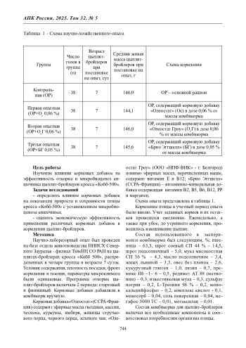 Кормление птицы в промышленном птицеводстве основывается на современных научных достижениях в сельском хозяйстве, биологии, физиологии и генетике. Оно ориентировано на генетический потенциал организма птицы и ставит перед собой цель полностью его реализовать [1]. Важными факторами, влияющими на продуктивность мясной птицы, является качество кормов и добавок, которые вводятся в комбикорм, уровень микробиологического фона в птичнике, технологические стрессы, которые сопровождают процесс выращивания птицы [2, 3]. Значительное снижение продуктивности наблюдается на фоне эймериоза, который вызывается простейшими [4]. Современные тенденции в птицеводстве связаны с снижением или полным отказом от применения антибиотиков при выращивании птицы, поиском средств, которые обладают комплексом противопаразитарных свойств при условии их низкой токсичности [5]. Поэтому современные научные разработки ориентированы на применение фитобиотиков. Важно выстроить стратегию при выращивании птицы так чтобы компоненты действовали разнопланово – обладали антипаразитарными свойствами, улучшали пищеварение, повышали сопротивляемость организма к неблагоприятным факторам окружающей среды [6]. Другим направлением для повышения продуктивности цыплят-бройлеров является применения витаминно-минеральных добавок. Их использование обосновано высокой технологической нагрузкой на организм птицы, приводящей к истощению внутренних биологических резервов и снижению продуктивности, а в отдельных случаях к болезням и гибели цыплят-бройлеров [7].