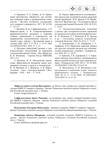 12. Полуночкина, Т. В., Дорофеева, С. Г., Трофимов, Р. Ю. Природная кормовая добавка как средство усиления контроля над субклиническим кокцидиозом у индейки // Аграрная наука. 2024. № 7. С. 24-27.