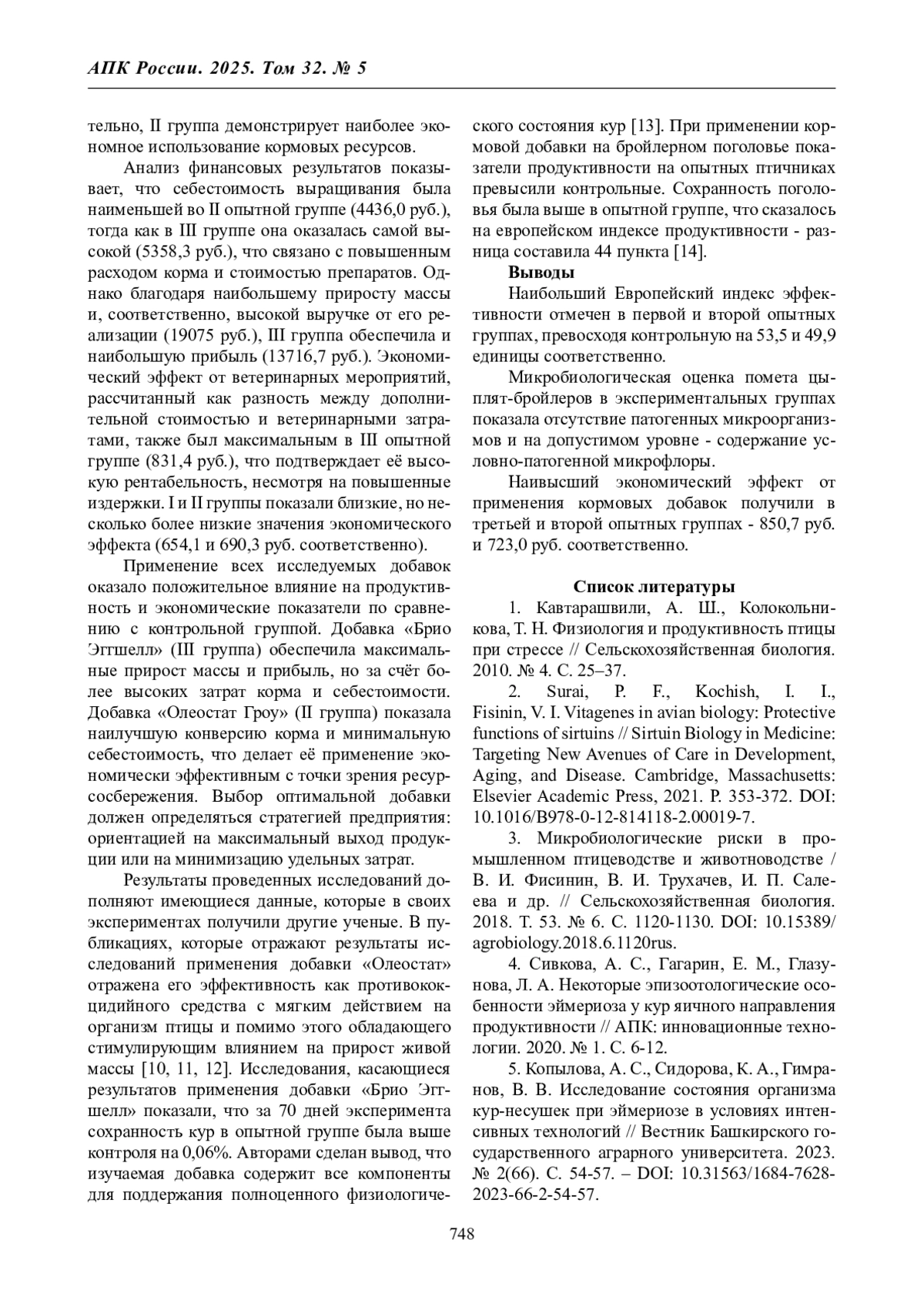1. Кавтарашвили, А. Ш., Колокольникова, Т. Н. Физиология и продуктивность птицы при стрессе // Сельскохозяйственная биология. 2010. № 4. С. 25-37.