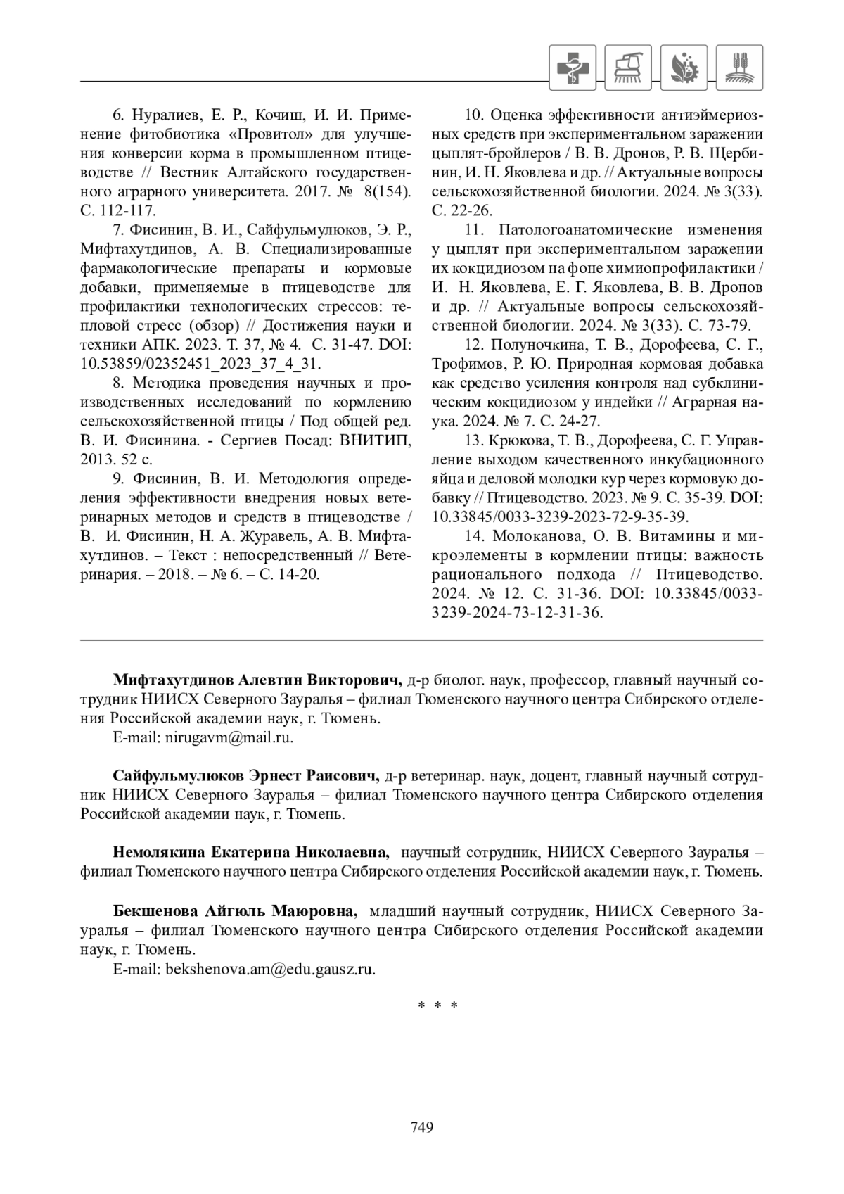 7. Фисинин, В. И., Сайфульмулюков, Э. Р., Мифтахутдинов, А. В. Специализированные фармакологические препараты и кормовые добавки, применяемые в птицеводстве для профилактики технологических стрессов: тепловой стресс (обзор) // Достижения науки и техники АПК. 2023. Т. 37, № 4. С. 31-47. DOI: 10.53859/02352451_2023_37_4_31