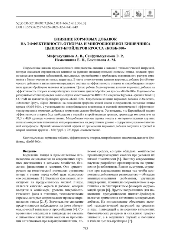 Современные вызовы промышленного птицеводства связаны с высокой технологической нагрузкой, которая оказывает отрицательное влияние на функции пищеварительной системы птицы, создавая предпосылки для развития заболеваний, вызываемых простейшими и требующих значительного ресурса организма в биологически активных веществах. В свете этого изучение влияния кормовых добавок фитобиотического действия и витаминно-минерального состава на эффективность откорма и микробиоценоз кишечника цыплят-бройлеров является актуальным. Целью работы было изучение влияния кормовых добавок на эффективность откорма и микробиоценоз кишечника цыплят-бройлеров кросса «Кобб-500». Научно-лабораторный опыт был проведен на базе отдела животноводства НИИСХ Северного Зауралья - филиал ТюмНЦ СО РАН на цыплятах-бройлерах кросса «Кобб 500». Определено влияние кормовых добавок «Олеостат», «Олеостат Гроу», «Брио Эггшелл» на показатели прироста живой массы и сохранность поголовья птицы кросса «Кобб-500», с установлением микробиоценоза кишечника и оценкой экономической эффективности применения кормовых добавок в кормлении цыплят-бройлеров. Установлено, что Европейский индекс эффективности откорма был наибольшим в первой и второй опытных группах, превосходя контрольную на 53,5 и 49,9 единицы соответственно. Микробиологическая оценка помета в экспериментальных группах показала отсутствие патогенных микроорганизмов и на допустимом уровне - содержание условно-патогенной микрофлоры. Лучший экономический эффект от применения кормовых добавок получили в третьей и второй опытных группах - 850,7 руб. и 723,0 руб. соответственно.