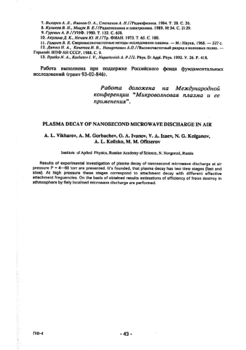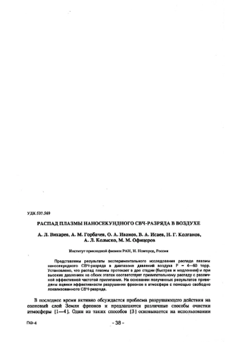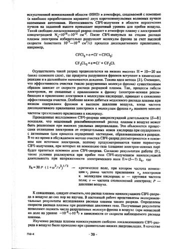 Представлены результаты экспериментального исследования распада плазмы наносекундного СВЧ-разряда в диапазоне давлений воздуха Р - 4–60 торр. Установлено, что распад плазмы протекает в две стадии (быстрая и медленная) и при высоких давлениях на обоих этапах соответствует прилипательному распаду с различной эффективной частотой прилипания. На основании полученных результатов приведены оценки эффективности разрушения фреонов в атмосфере с помощью свободно локализованного СВЧ-разряда