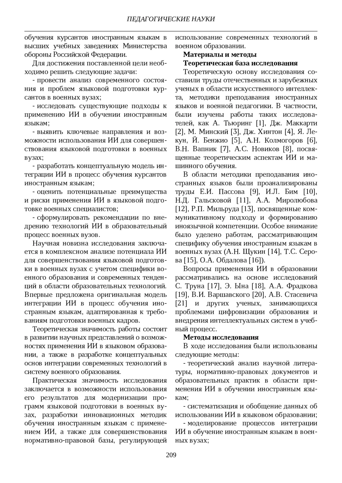 Исследование посвящено изучению потенциала искусственного интеллекта (далее - ИИ) в контексте повышения эффективности обучения иностранным языкам курсантов военных вузов. Автор провел углубленный анализ научной литературы, нормативных документов и существующих образовательных практик с целью выявления наиболее перспективных направлений применения ИИ в языковой подготовке. В рамках исследования была разработана концептуальная модель интеграции ИИ в учебный процесс, учитывающая специфику военного образования и современные требования к профессиональной иноязычной компетенции офицеров. Ключевыми результатами работы стали: выявление основных направлений применения ИИ (адаптивное обучение, автоматизированный анализ языковых компетенций, генерация учебного контента, персонализация обучения), обоснование необходимости комплексного подхода к внедрению ИИ в языковую подготовку, разработка оригинальной модели интеграции ИИ, учитывающей специфику военного образования. Научная новизна исследования заключается в проведении комплексного анализа потенциала ИИ в контексте военного языкового образования и разработке оригинальной модели интеграции ИИ. Практическая значимость работы состоит в возможности использования полученных результатов для модернизации программ языковой подготовки в военных вузах, разработки инновационных методик обучения и совершенствования нормативно-правовой базы.