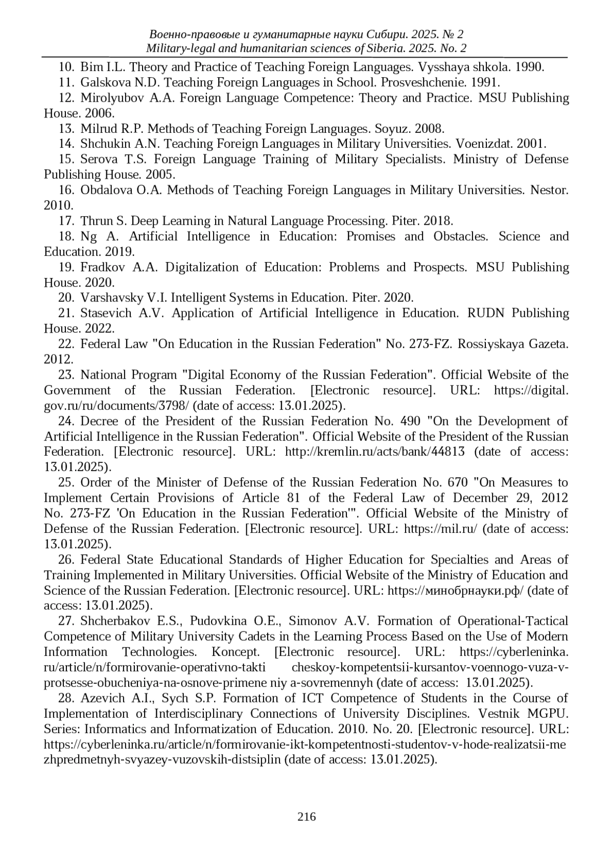26. Федеральные государственные образовательные стандарты высшего образования по специальностям и направлениям подготовки, реализуемым в военных вузах // Официальный сайт Минобрнауки РФ. [Электронный ресурс]. URL: https://cyberleninka.рф/(дата обращения: 13.01.2025).