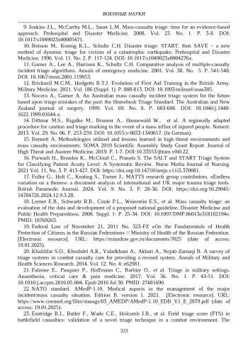 32. Rush S.C., Lauria M.J., DeSoucy E.S., Koch E.J., et al. Limitations of Triage in Military Mass Casualty Response: A Case Series. Journal of Special Operations Medicine. 2024. Vol. 24. No. 3. Р. 62-66. DOI: 10.55460/0GO5-QW03 EDN: MJJCQX