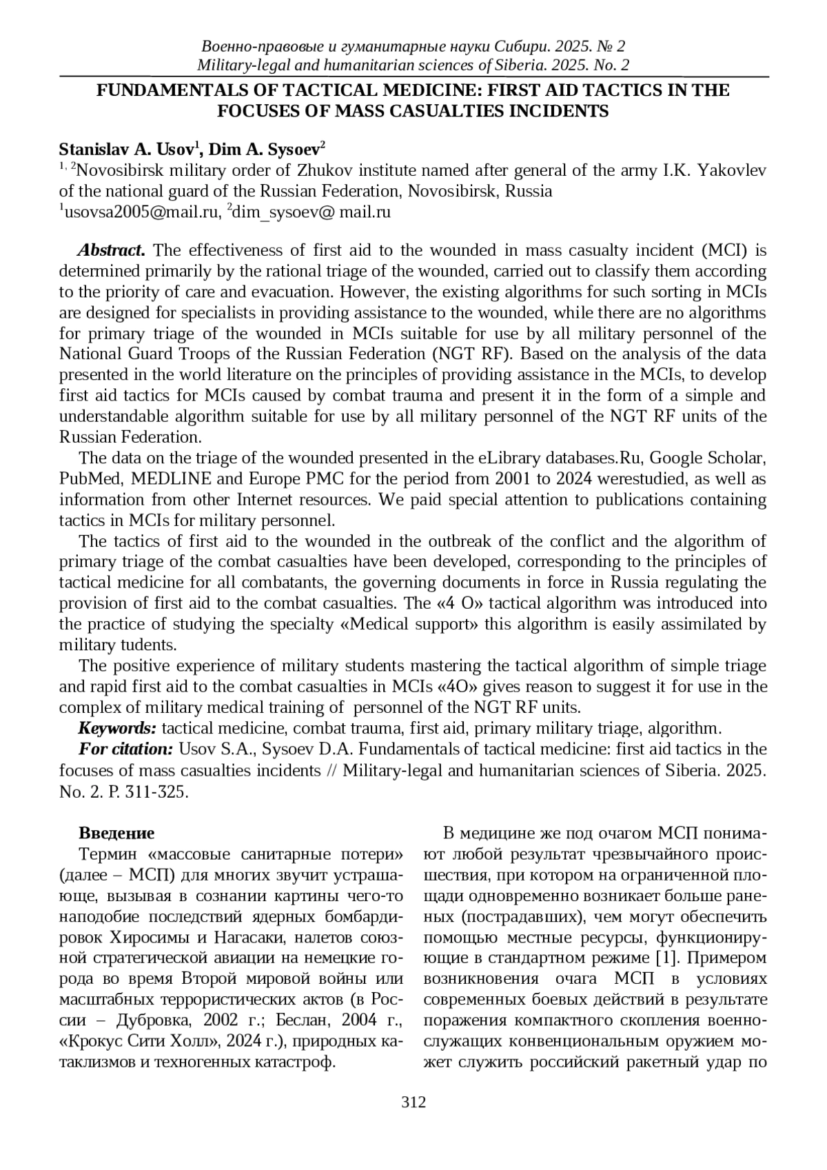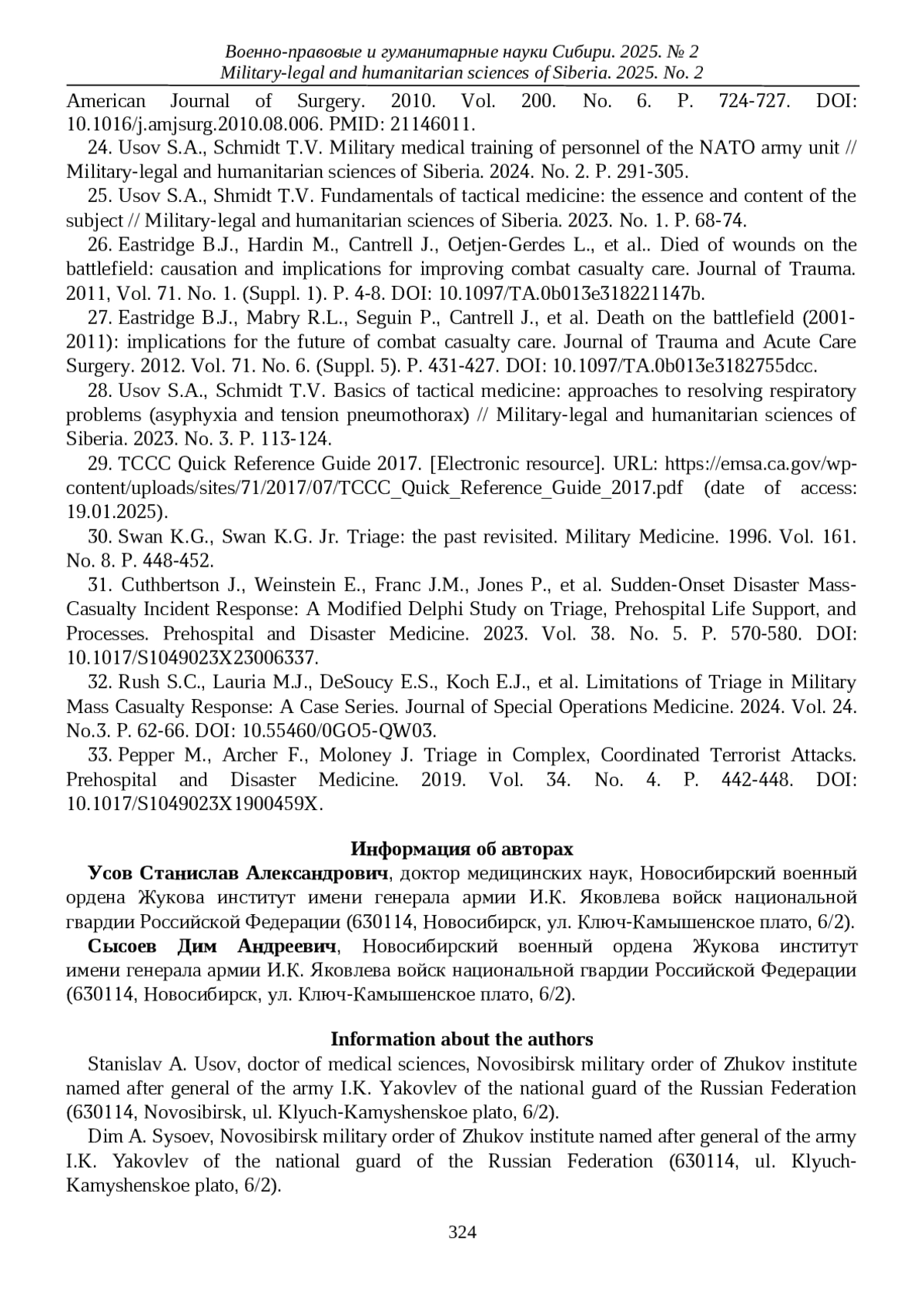 25. Усов С.А., Шмидт Т.В. Основы тактической медицины: сущность и содержание предмета // Военно-правовые и гуманитарные науки Сибири. 2023. № 1. С. 68-74. EDN: EYXUGM