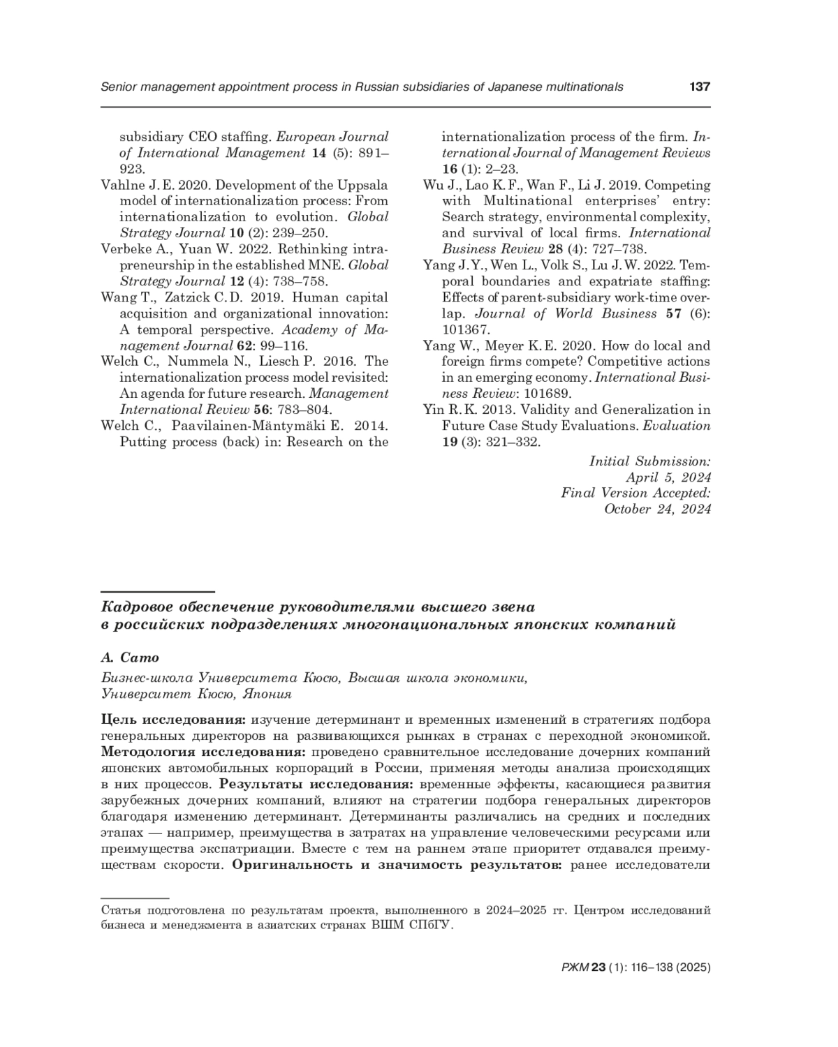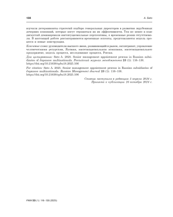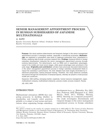 59. Sato A., Panibratov A. 2024. Transforming the liability of outsidership into assets of outsidership: A comparative study of Japanese automotive subsidiaries in Russia. Asia Pacific Business Review 30 (1): 72-93.